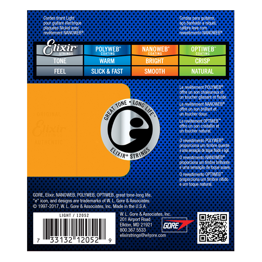 - Bộ Dây Đàn Guitar Electric Elixir 12052 được làm bằng dây thép bọc niken, phủ Nanoweb rất mỏng khiến người chơi thấy giống như đang chơi dây thông thường, tạo sự thoải mái khi sử dụng.