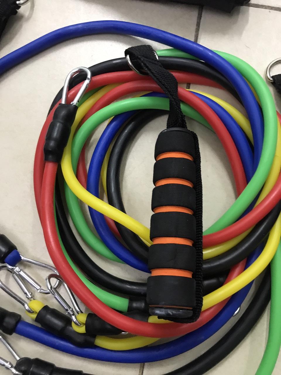 Bộ dây đàn hồi tập thể lực có 5 dây, mỗi dây có mức trọng lượng khác nhau, từ nhẹ tới nặng (8 lbs, 15 lbs, 20 lbs, 25 lbs, 30 lbs) có thể