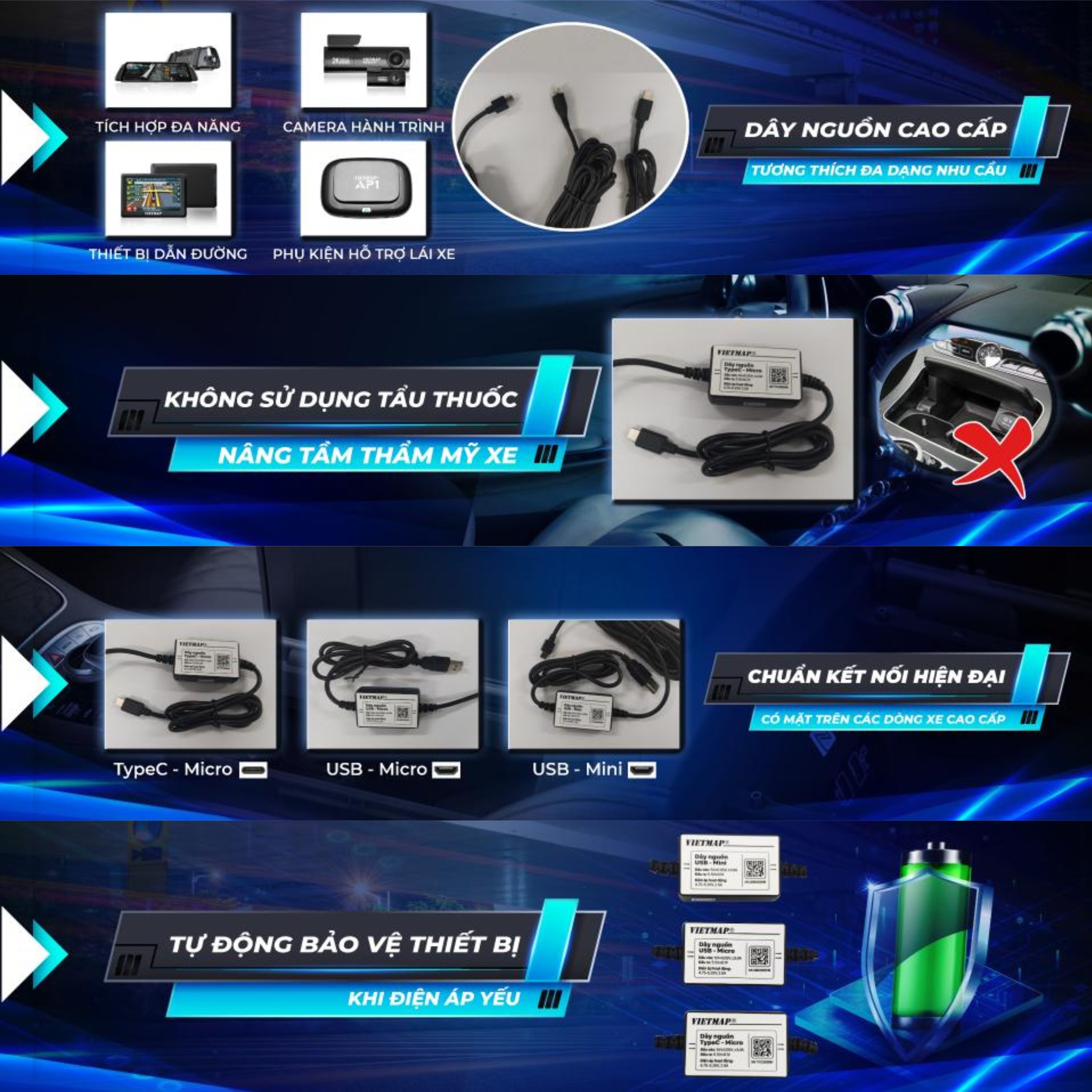 Giải Pháp Dây Ng.uồn Cao Cấp VIETMAP với chuẩn kết nối hiện đại tương thích mọi dòng xe cao cấp, thiết kế nhỏ gọn dễ dàng lắp đặt, không cần sử dụng tẩ.u th.uốc, dễ dàng giấu kín giúp nội thất xe trở nên gọn gàng và nâng cao tính thẩm mỹ không gian trong xe.
