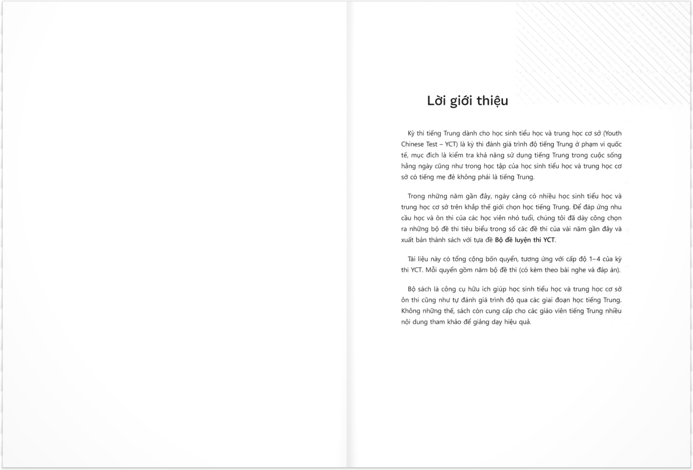 Ngày nay, rất nhiều quốc gia và khu vực trên thế giới có ngôn ngữ mẹ đẻ không phải tiếng Trung đã đưa ngôn ngữ này vào hệ thống giáo dục quốc dân. Vì vậy, số học sinh bậc tiểu học và trung học ở những nơi đó theo học tiếng Trung có xu hướng ngày càng tăng. Để giúp các em làm tốt bài thi YCT (Youth Chinese Test) – bài kiểm tra chuẩn ở cấp độ quốc tế về trình độ tiếng Trung, chúng tôi đã biên soạn sách Bộ đề luyện thi YCT.