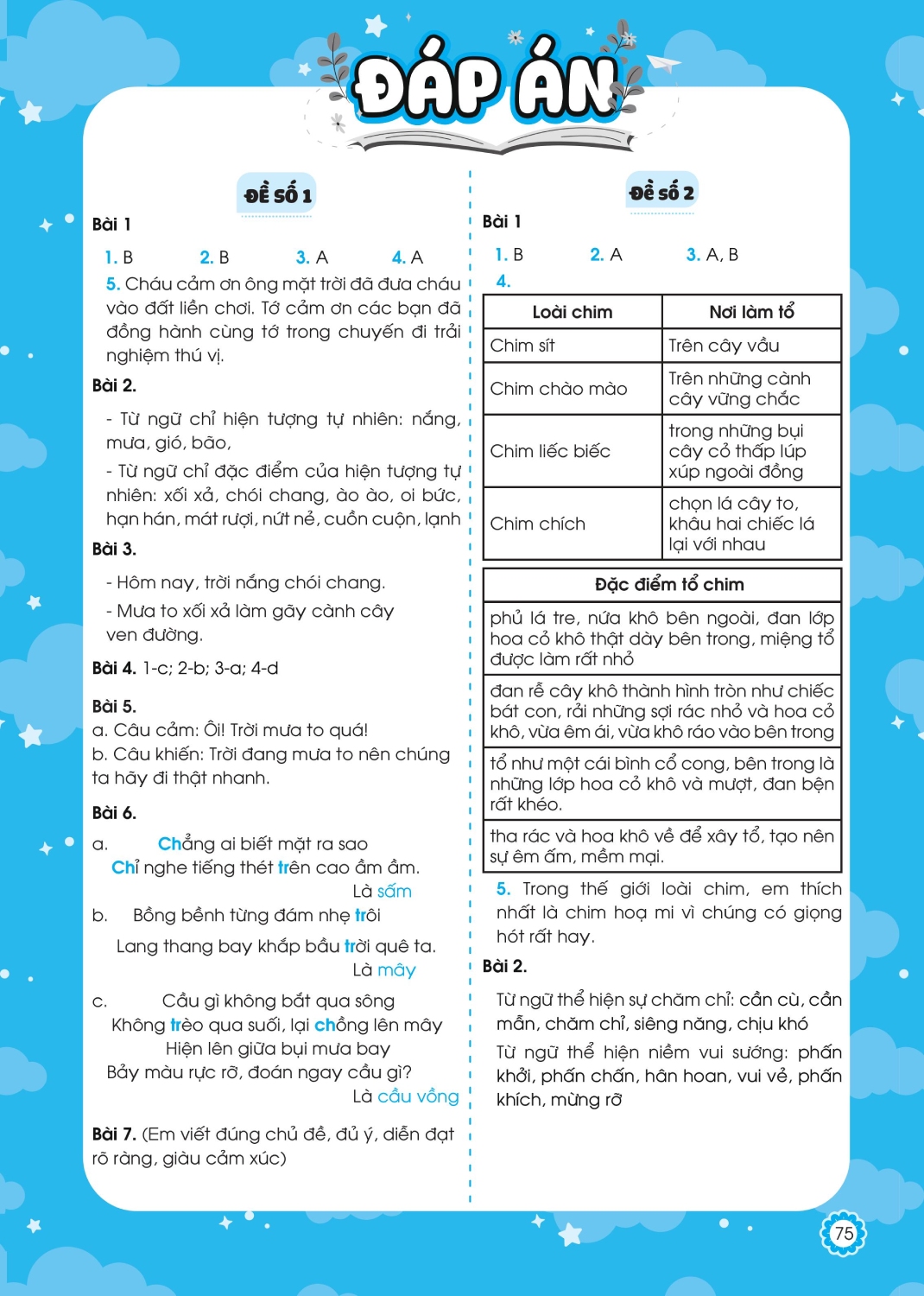 - Sách được chia thành 2 phần rất dễ hiểu cho các bé: Phần đề ôn tập và Phần đề kiểm tra. Phần đề ôn tập: Gồm 18 đề được chia theo các chủ điểm, hoặc chia thành các đề ôn tập theo sát chương trình học trên lớp theo giai đoạn. Phần đề kiểm tra: Gồm 5 đề kiểm tra cuối học kỳ để kiểm tra, đánh giá kiến thức tổng hợp của học sinh.