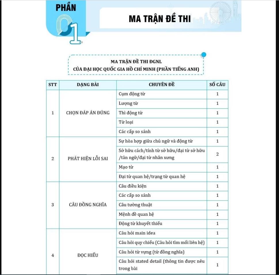 Phần 4: Phần đề thi gồm 60 đề phát triển theo form đề thi ĐGNL của Đại học Quốc gia Hà Nội (ĐHQG HN), Đại học Quốc gia TP.HCM (ĐHQG HCM), và Đại học Sư phạm Hà Nội (ĐHSP HN)