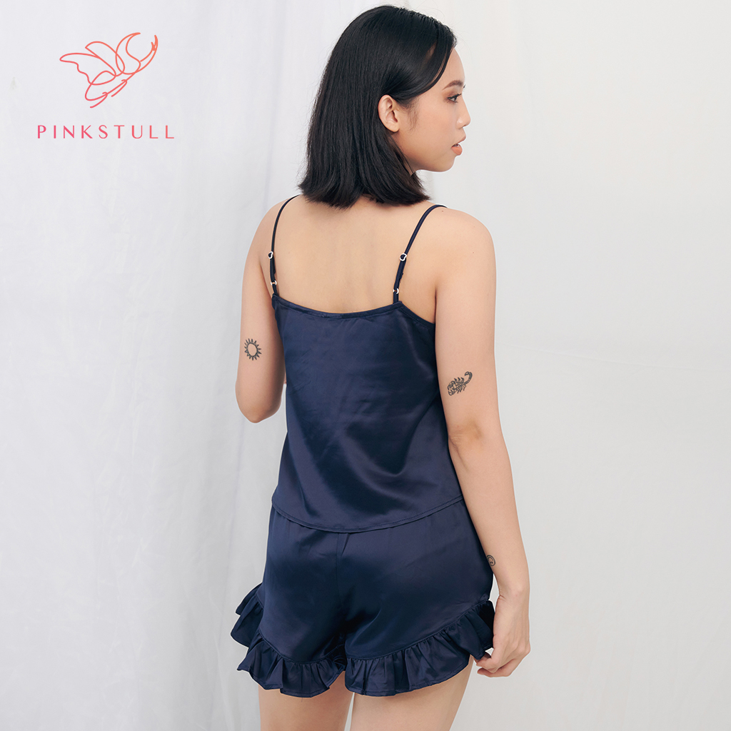 ✨Bộ đồ ngủ hai dây ngắn Pink Stull nút bọc xanh đậm