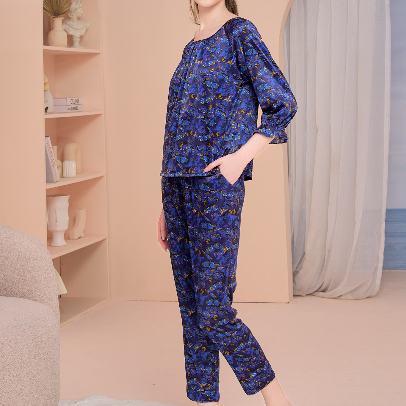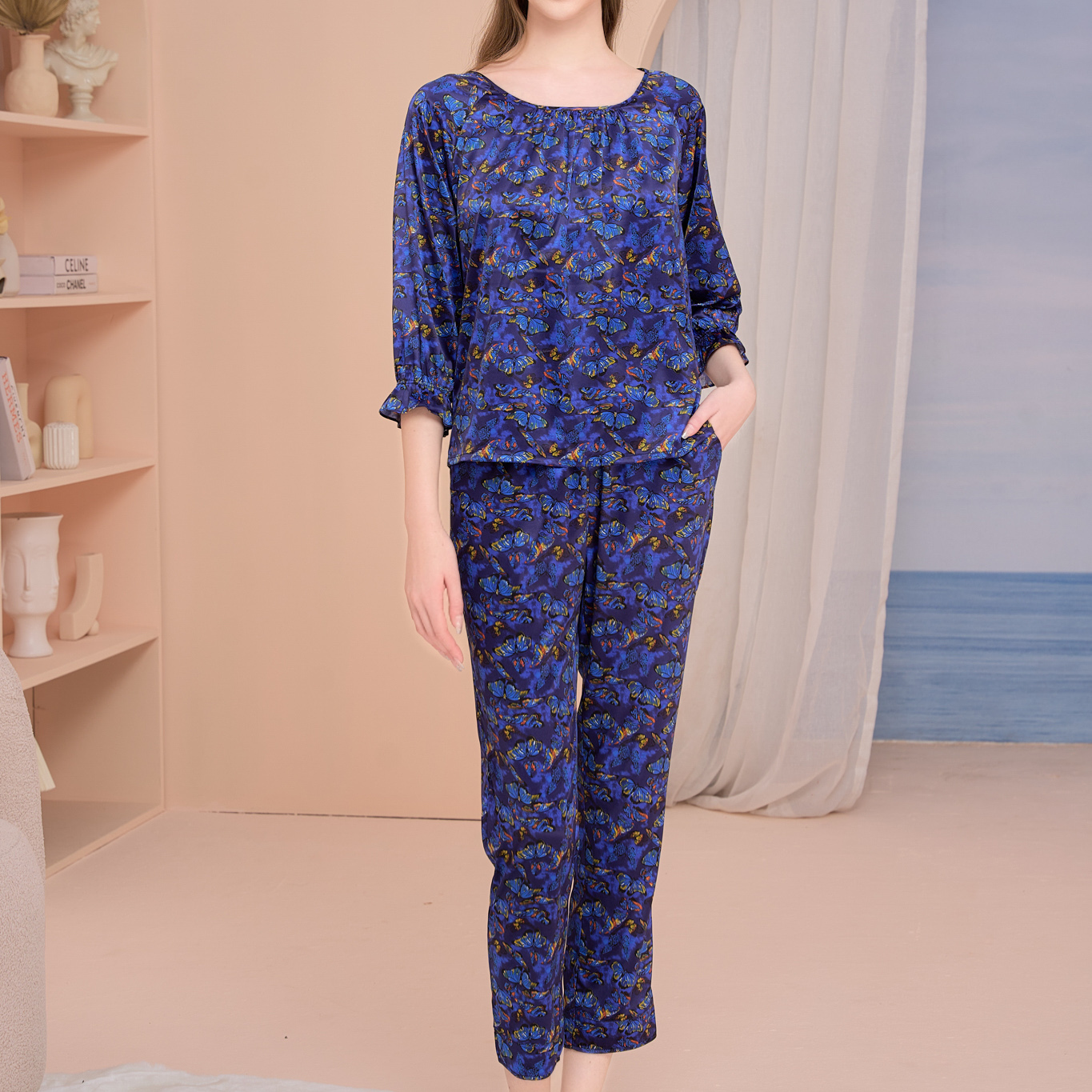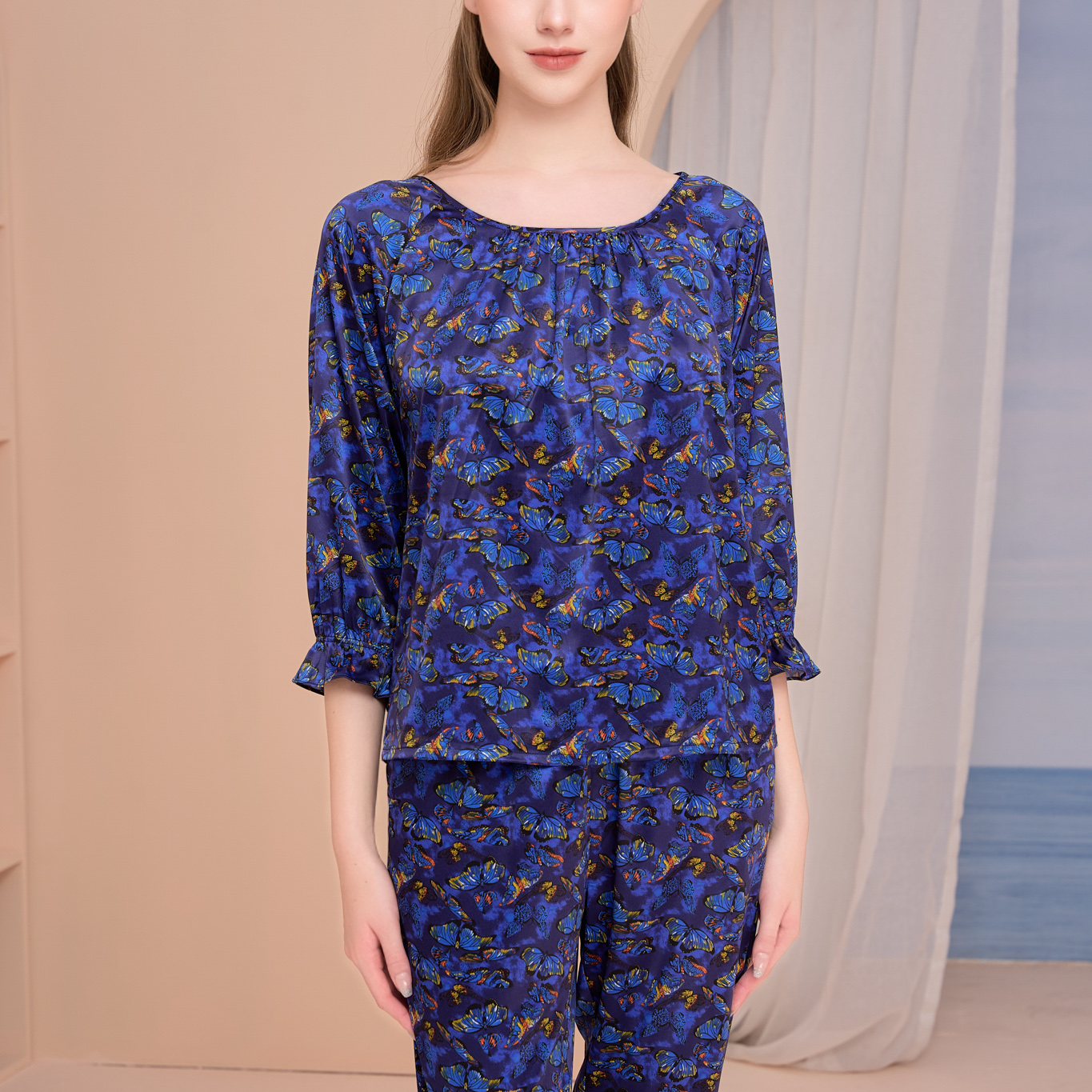 Bộ satin dài, áo cổ tròn tay lửng dún nhẹ.