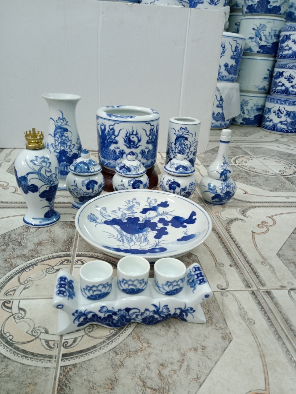 Bộ đồ thờ Gốm Sứ Bát Tràng men lam vẽ vàng 24K #gomsubattrang #phuclocvienminh #gomsucaocap #gốmsứ