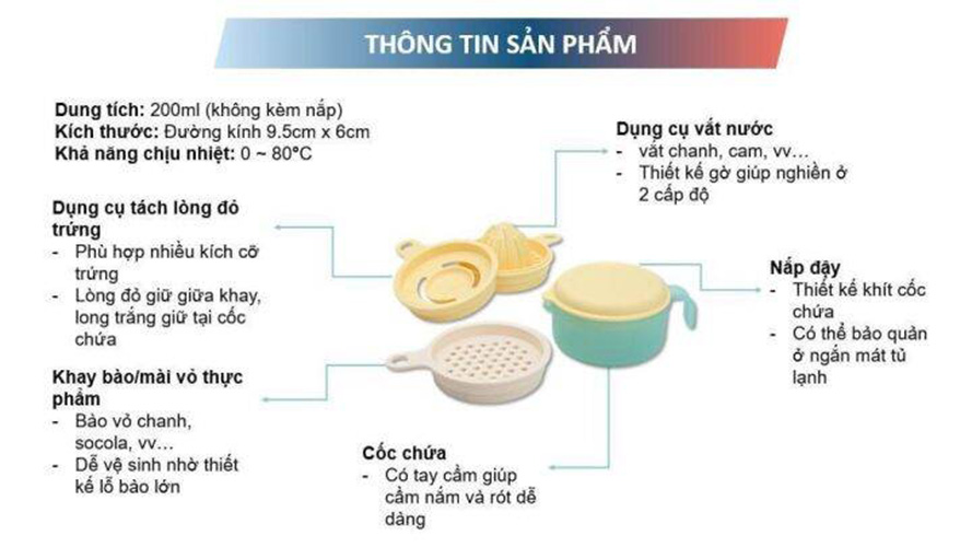 • Bộ dụng cụ đa năng bao gồm: tách lòng đỏ trứng, khay bào/ mài vỏ, vắt nước và cốc chứa