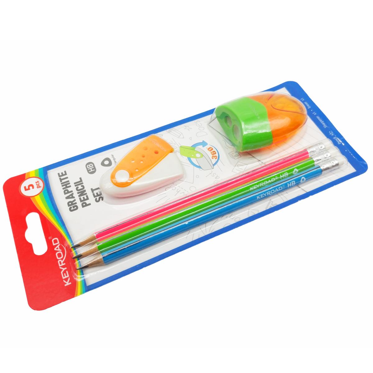 Bộ dụng cự gồm : 3 bút chì HB tam giác + 1 gọt bút chì + 1 gôm tẩy.