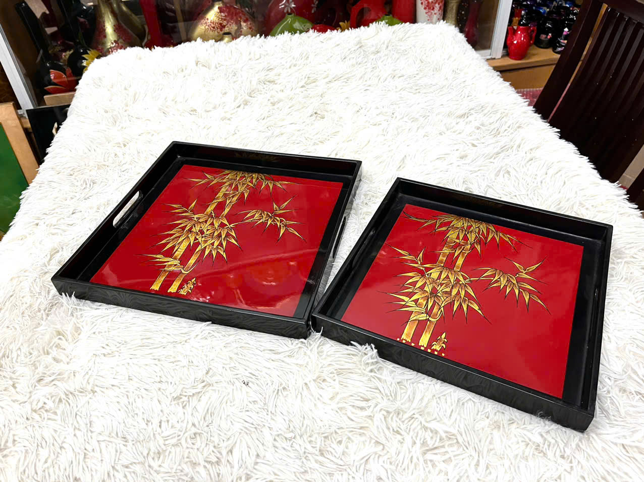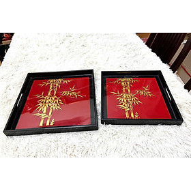 Khay được làm từ chất liệu gỗ tự nhiên sơn mài khảm trứng tỉ mỉ, độc đáo Kích thước: khay lớn 32x3 cm/ khay nhỏ 28x3 cm Khay dùng để bộ ấm chén, bưng bê, để đồ deco trang trí trong nhà hàng, khách sạn rất sang trọng hoặc làm quà tặng khách, tặng người thân, bạn bè vô cùng ý nghĩa.