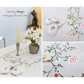 Bộ khăn trải bàn ăn thêu tay thương hiệu thêu tay Tân Mỹ - Mẫu cành đào chim. Bộ sản phẩm bao gồm bộ khăn ăn thêu cùng màu. Kiểu và cỡ hiện có tại