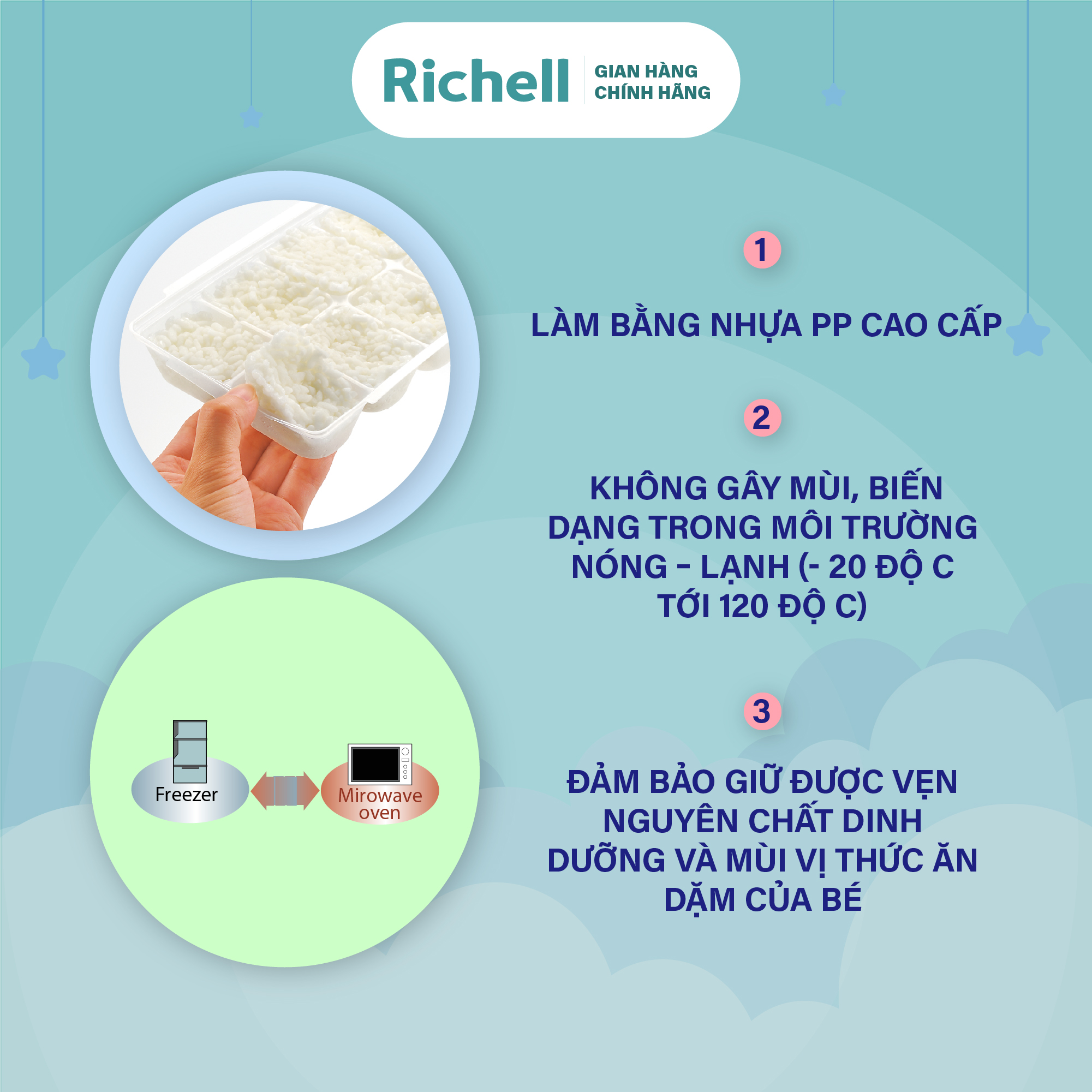- Bộ khay trữ đông thức ăn dặm Richell giúp mẹ chia nhỏ khẩu phần và trữ đông thức ăn dặm chỉ trong 1 bước! Tiết kiệm diện tích tủ lạnh và thời gian nấu nướng cho mẹ khi chỉ cần sơ chế 1 lần và trữ đông dùng ngay được từ 3 tới 7 ngày tiếp theo.