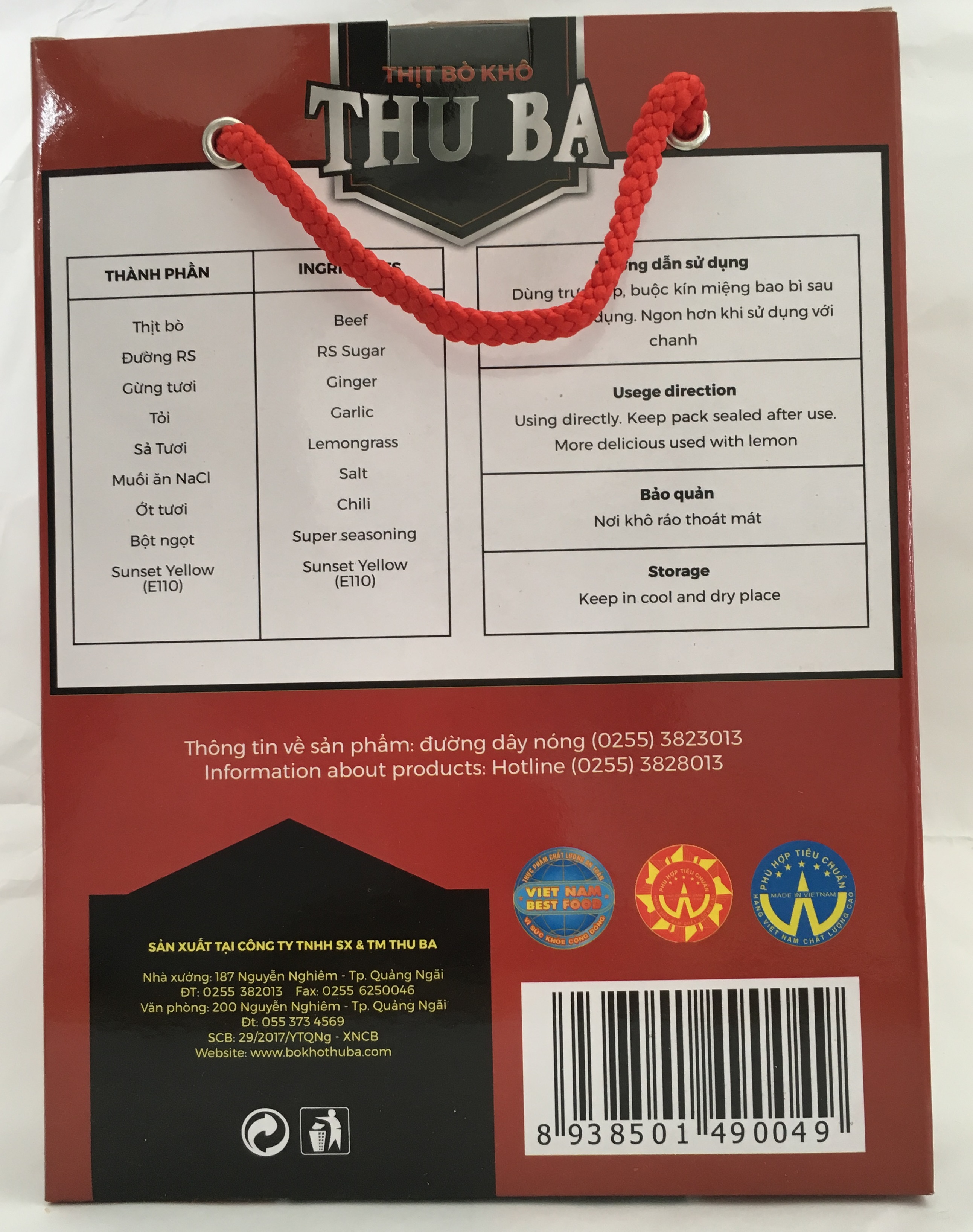 Bao bì có thể thay đổi theo từng đợt sản xuất, chất lượng không đổi Được làm từ 100% thịt bò bò tươi Không chất bảo quản độc hại BÒ KHÔ THU BA là món đặc