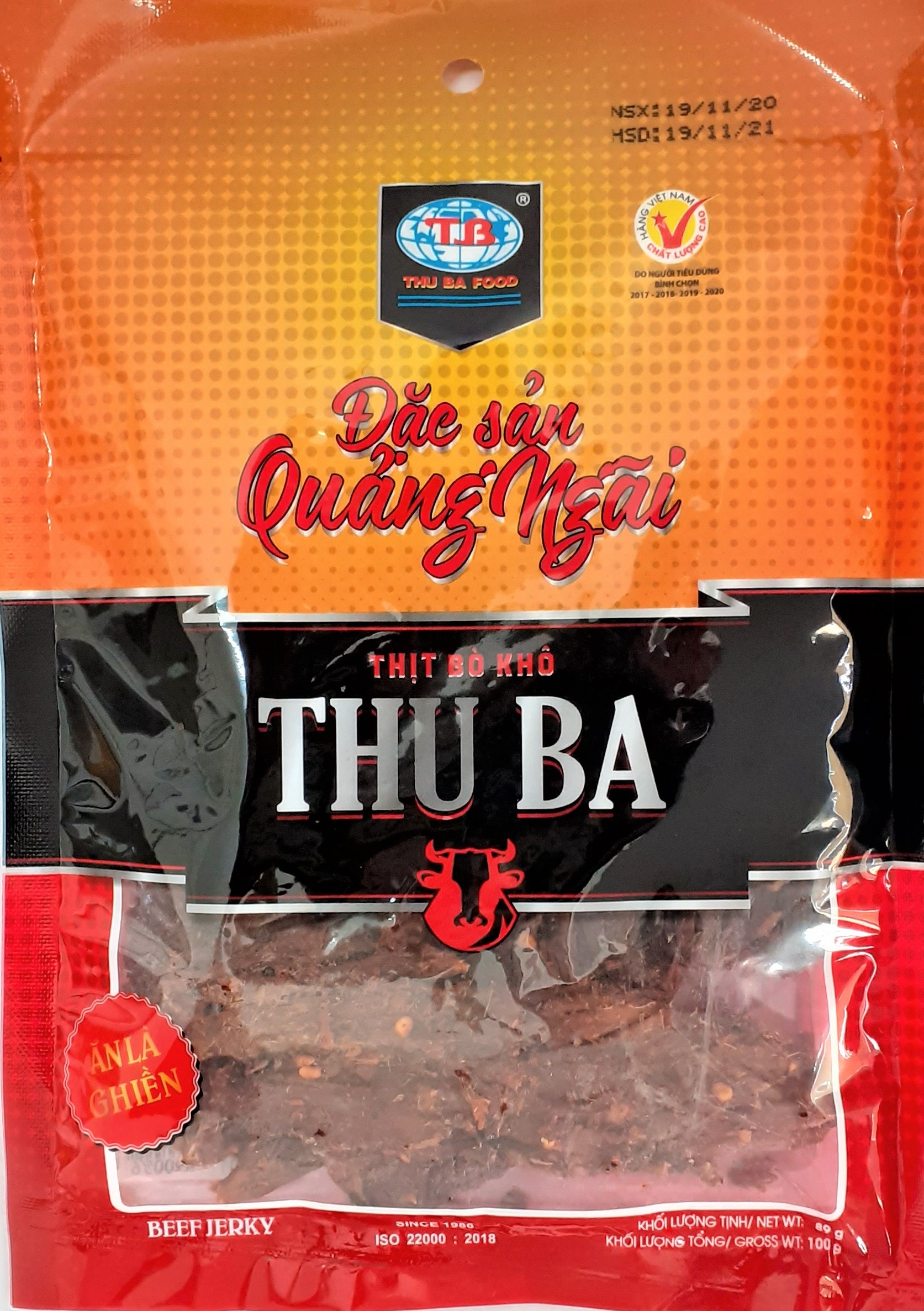 BÒ KHÔ THU BA là món đặc sản Quảng Ngãi, đạt tiêu chuẩn ISO 22000:2018 và là Hàng Việt Nam Chất Lượng Cao do Người tiêu dùng bình chọn Sản phẩm được sản xuất theo công thức