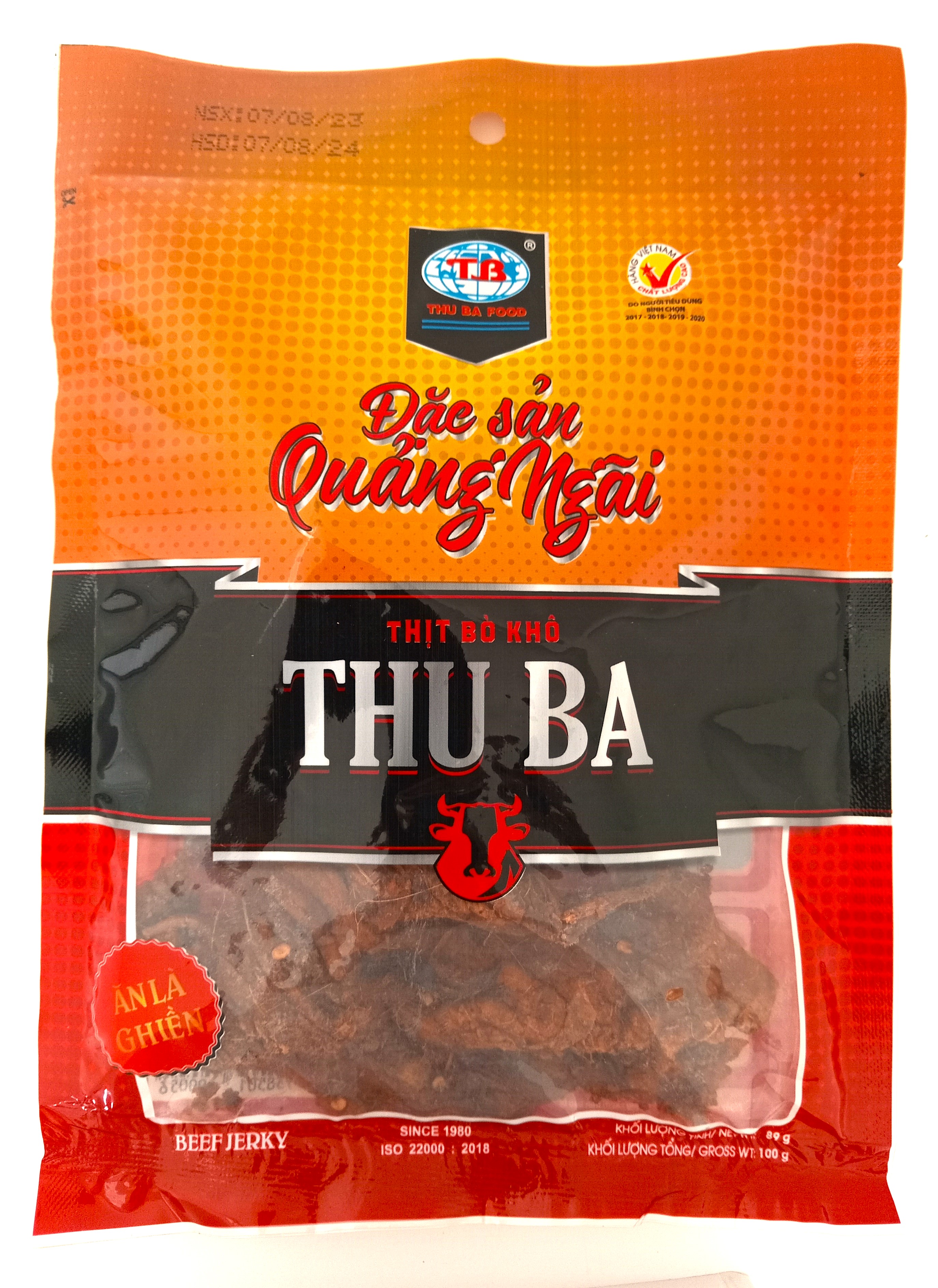 BÒ KHÔ THU BA là món đặc sản Quảng Ngãi, đạt tiêu chuẩn ISO 22000 và là Hàng Việt Nam Chất Lượng Cao do Người tiêu dùng bình chọn từ 2017 đến 2024 Sản phẩm được sản