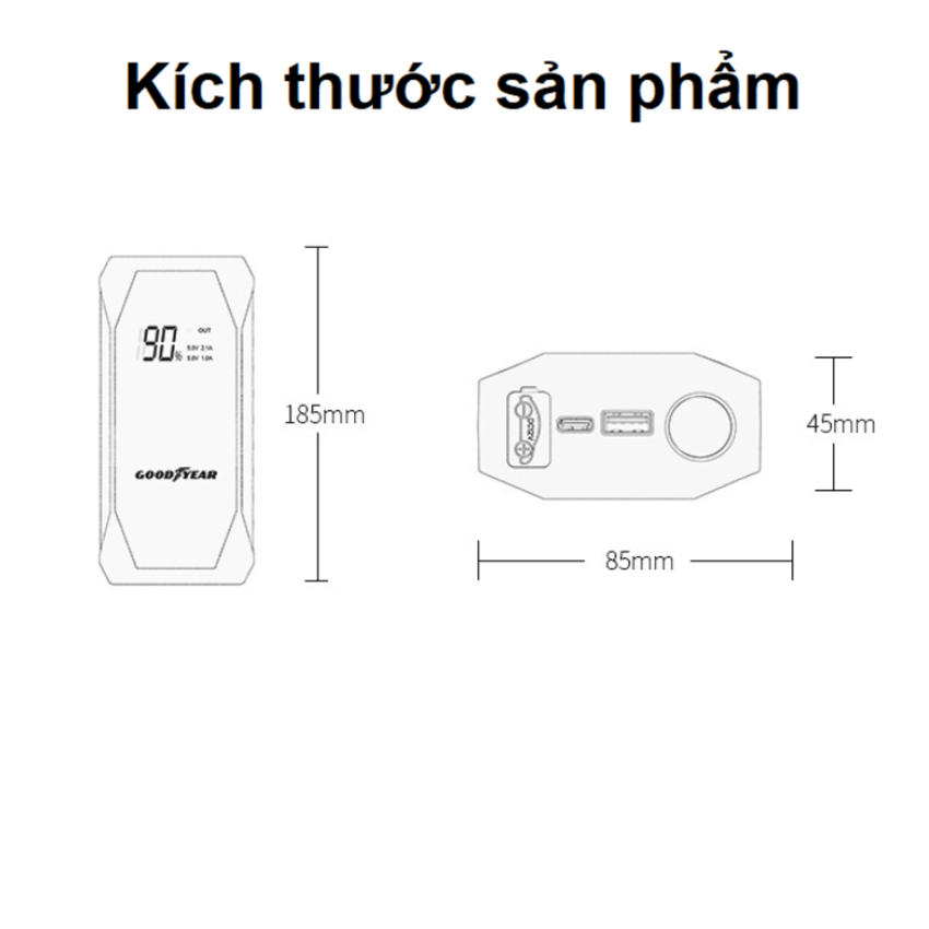 Bộ kích bình điện ô tô, kiêm pin sạc dự phòng Goodyear GY-5295, dung lượng 10000mAh Goodyear là một trong những công ty sản xuất lốp xe lớn nhất thế giới. Không chỉ nổi tiếng trong lĩnh vực sản xuất các loại lốp xe mà còn liên tục phát triển nghiên cứu các dòng sản phẩm phụ kiện cao cấp trang bị cho ô tô. Giới thiệu kích điện ô tô kiêm sạc dự phòng cao cấp Goodyear GY-5295, 10000mAh Giới thiệu kích bình điện ô tô kiêm pin sạc dự phòng Goodyear GY-5295