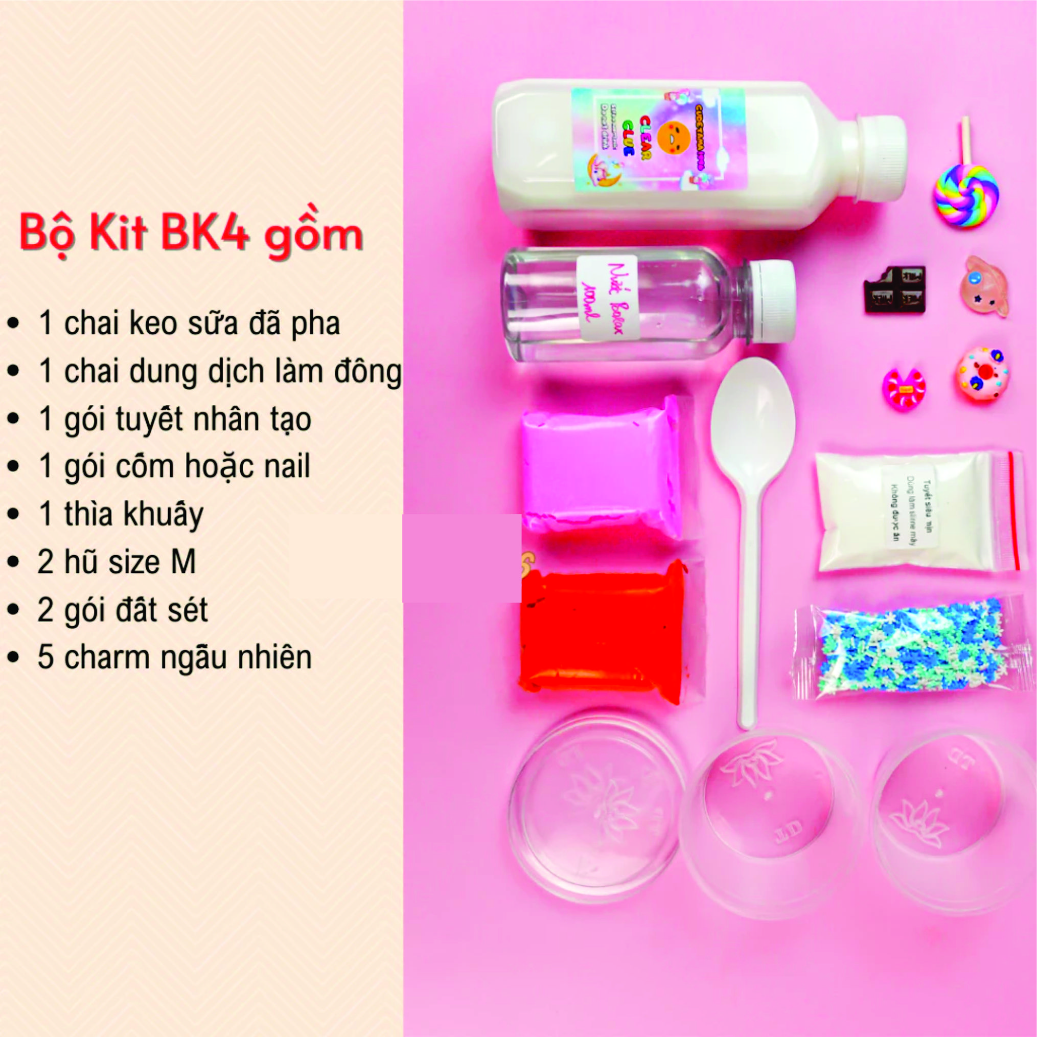 Mua tại TiktokBộ kit làm slime mây BK4 bao gồm: - 1 chai keo sữa pha sẵn - 1 chai activator 100ml màu trong suốt - 2 hộp size M (100ml/hộp) - 5 charm ngẫu nhiên - 1 gói tuyết nhân tạo siêu mịn - 1 gói cốm hoặc nail - 2 gói đất sét Nhật - 1 thìa khuấy ngẫu nhiên - 1 tờ hướng dẫn làm slime