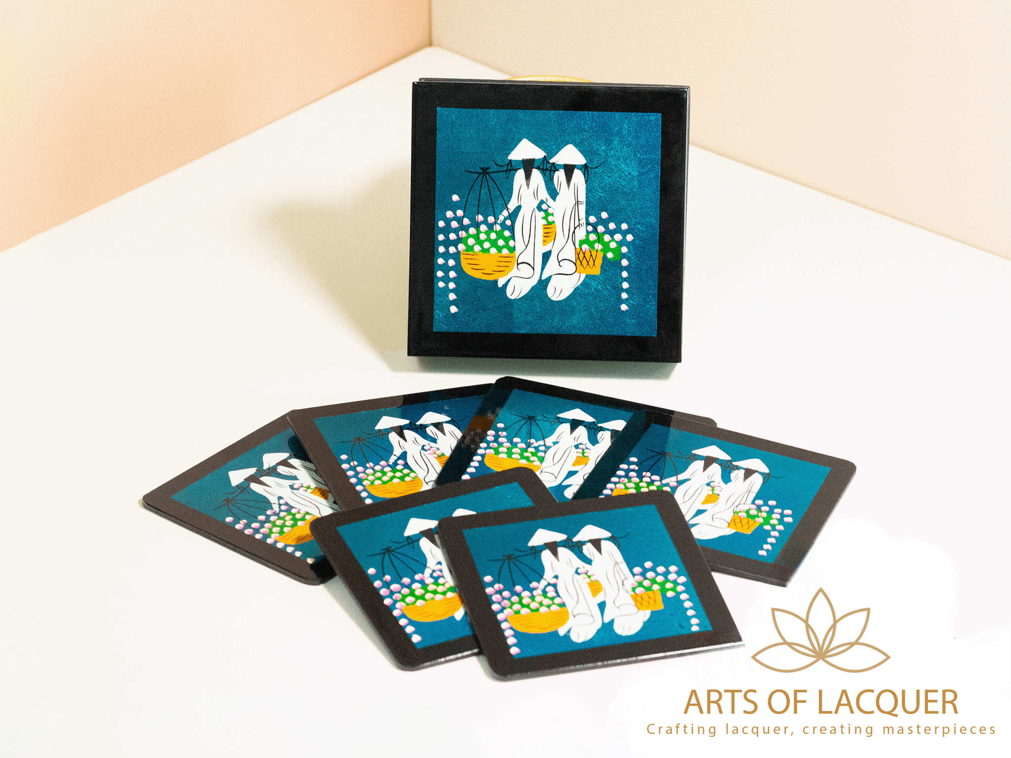 Đây là một bộ sáu chiếc đế lót ly được thiết kế vô cùng tinh xảo và độc đáo. Mỗi chiếc lót ly có hình vuông, được đặt trong một khung màu đen mạnh mẽ tạo nên sự tương phản rõ rệt với hình ảnh trung tâm. Nền của hình ảnh trên lót ly là màu xanh dương nhẹ nhàng, tạo cảm giác thanh bình và dễ chịu. Hình ảnh nổi bật trên nền xanh là hai người phụ nữ mặc trang phục áo dài truyền thống Việt Nam và đội trên đầu chiếc nón lá. Trên vai họ là những gánh hoa chứa những bông hoa màu sắc tươi sáng mang đậm bản sắc văn hóa Việt.