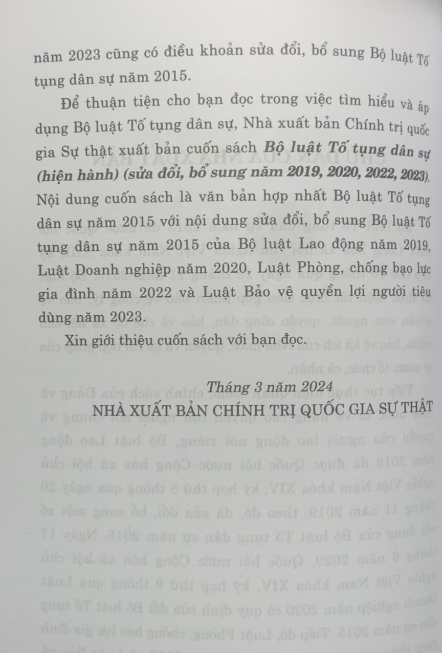 Để thuận tiện cho bạn đọc trong việc tìm hiểu và áp dụng Bộ luật Tố tụng dân sự, Nhà xuất bản Chính trị quốc gia Sự Bộ luật Tố tụng dân sự (hiện hành) (sửa đổi, bổ sung năm 2019, 2020, 2022, 2023). Nội dung cuốn sách là văn bản hợp nhất Bộ luật Tố tụng dân sự năm 2015 với nội dung sửa đổi, bổ sung Bộ luật Tố tụng dân sự năm 2015 của Bộ luật Lao động năm 2019, Luật Doanh nghiệp năm 2020, Luật Phòng, chống bạo lực gia đình năm 2022 và Luật Bảo vệ quyền lợi người tiêu dùng năm 2023.