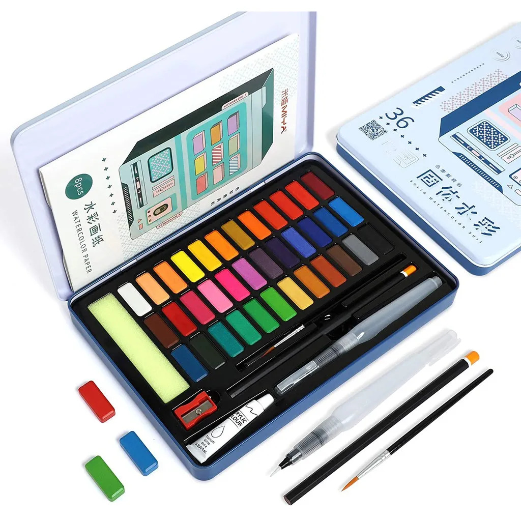 ✨Bộ màu nước dạng nén 36 màu Himi hộp thiếc tặng cọ nước, cọ tỉa, bút chì, màu Acrylic, đồ chuốt - Watercolor Kit