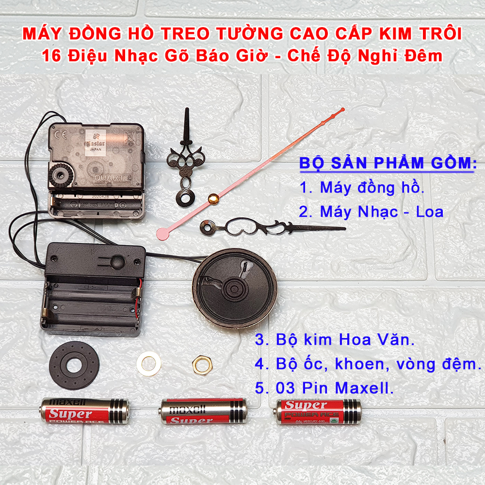 ✨Bộ Máy Đồng Hồ NHẠC CHUÔNG 16 điệu NHẠC Báo Giờ + Máy Đồng Hồ Kim Trôi Cao Cấp EASTAR + Bộ Kim HOA VĂN – Kèm theo 03 Pin Maxell