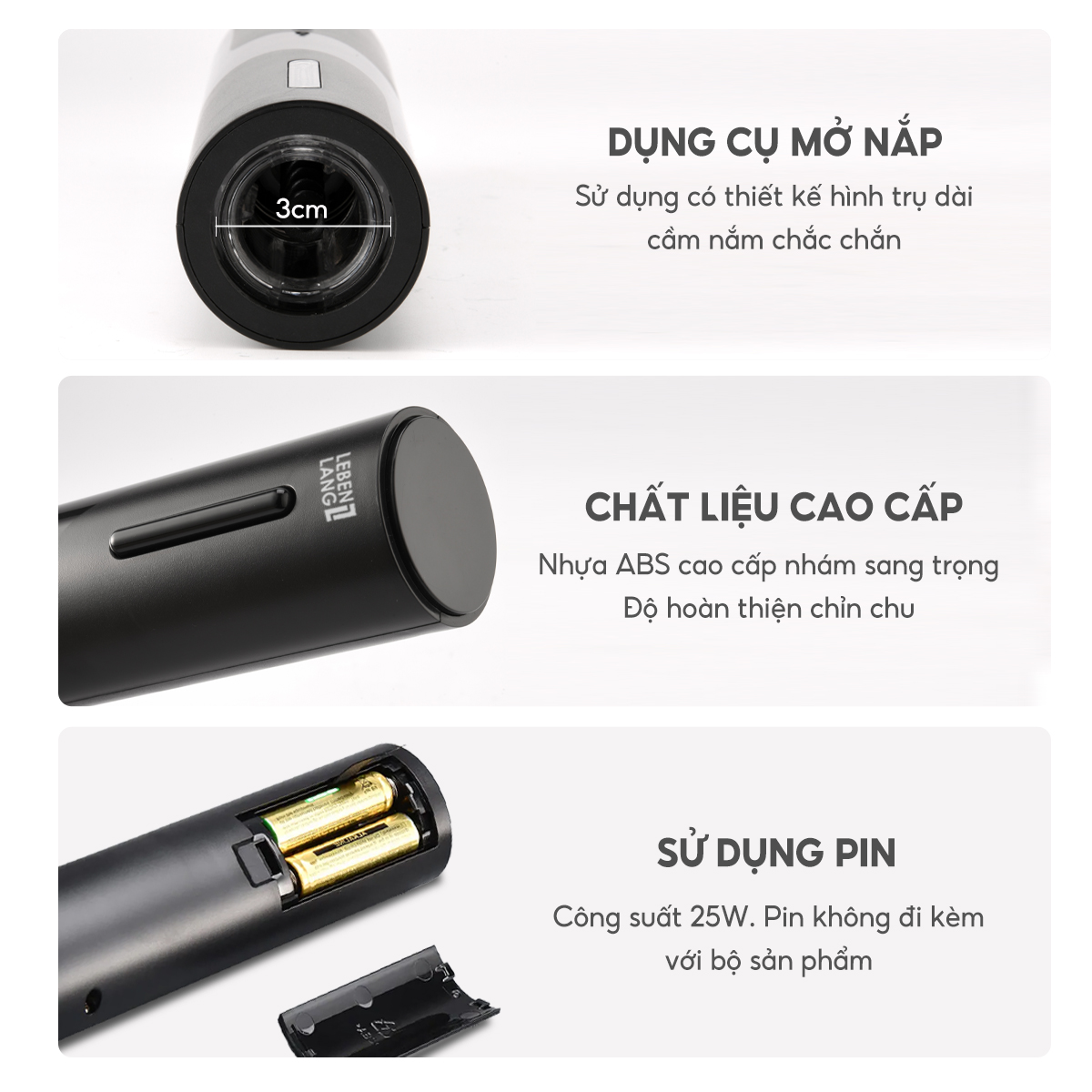 - Bộ mở rượu vang điện Lebenlang LBL2021 là phụ kiện không thể thiếu cho bất kỳ tín đồ rượu vang nào, mang lại sự tiện lợi tối đa với thiết kế không dây, dùng pin sạc