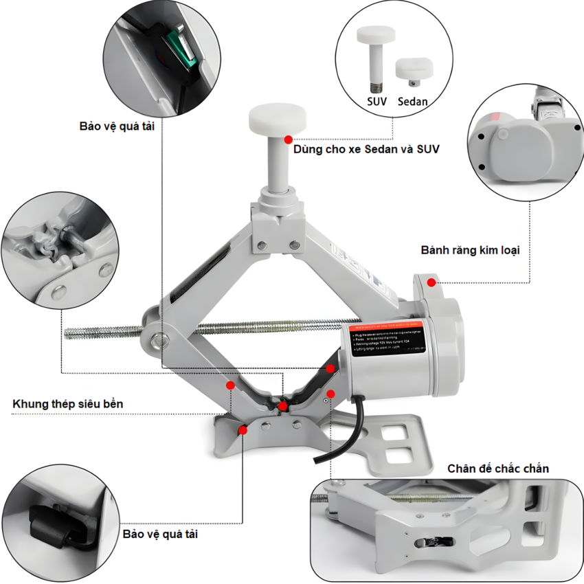 Bộ dụng cụ thay lốp xe ô tô đa năng bao gồm: - Kích (con đội an toàn) với hành trình từ 15cm đến 45cm,thời gian nâng 2-3 phút,tải trọng tối đa 5000kg. - Dụng