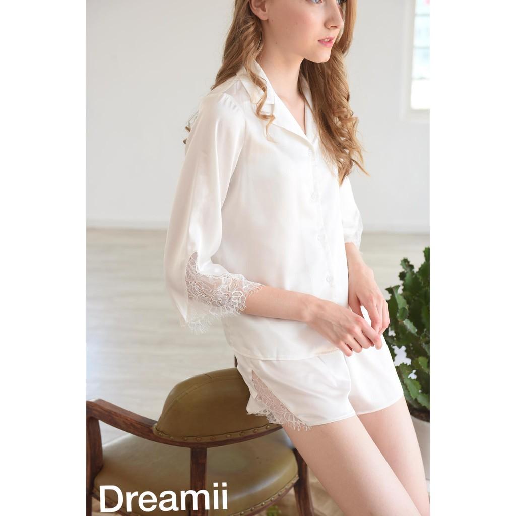 Đồ bộ mặc nhà lụa cao cấp WANNABE BSS39 đồ bộ quần sọt phối áo 2 dây lưng cut-out viền ren gợn sóng trẻ trung quyến rũ Đồ bộ mặc nhà phi lụa cao cấp