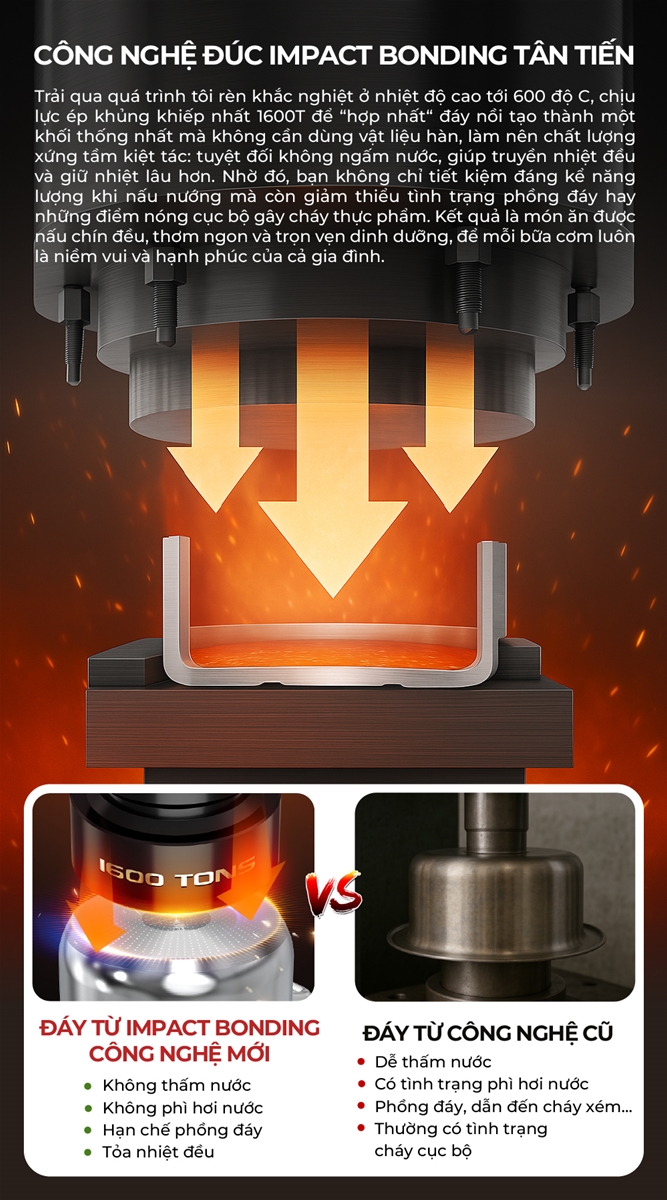 SẢN PHẨM ĐƯỢC ĐÚC & DẬP NGUYÊN KHỐI Khác với những loại nồi inox dùng cho bếp từ khác đang được bán phổ biến trên thị trường chỉ được DÁN đáy từ, Nồi inox Tsubame