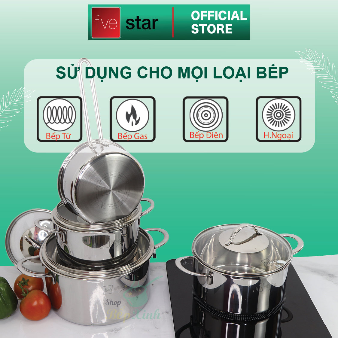 Bộ nồi gồm có : +1 Nồi Fivestar đường kính 16cm, chiều cao 9cm + nắp inox quai silicon + 1 Nồi Fivestar đường kính 20cm, chiều cao 12cm + nắp inox quai silicon +