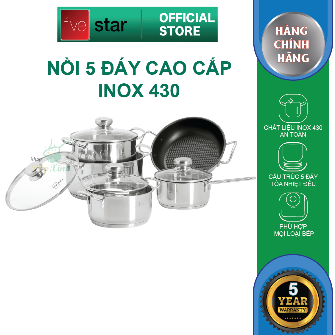 Bộ nồi Five Star Cao Cấp inox 304 Kitchi Nắp Kính mới