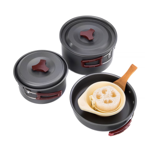 Bộ nồi dã ngoại bằng hợp kim nhôm cao cấp nhỏ gọn, chống mài mòn dẫn nhiệt tốt. Bộ nồi dã ngoại cắm trại nhỏ gọn 3 món bằng hợp kim nhôm đặc biệt chống