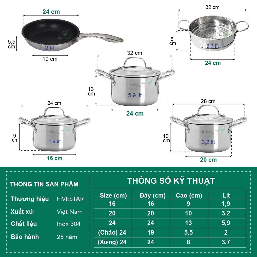 Bộ nồi, chảo 5 đáy Inox 304 Fivestar Plus FPB55D001 vung kính đáy từ, bảo hành 25 năm