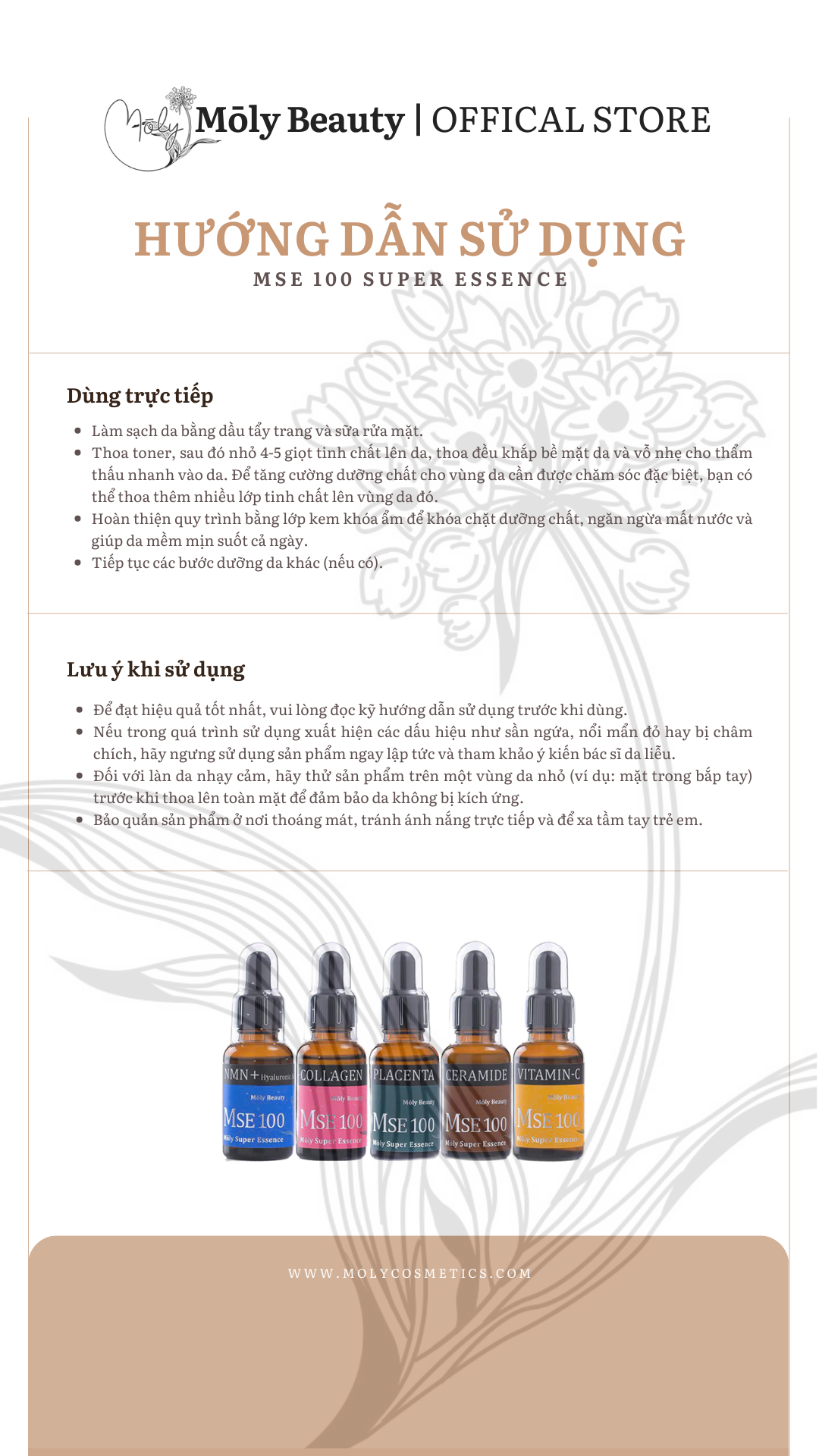 MÔ TẢ: Bộ quà tặng MSE100 tinh chất phục hồi trẻ hóa da NMN+HY 30ml + MSE100 tinh chất nhau thai tái sinh Placenta 30ml - Mōly Beauty Thương hiệu: Mōly Beauty Quy cách: 30ml