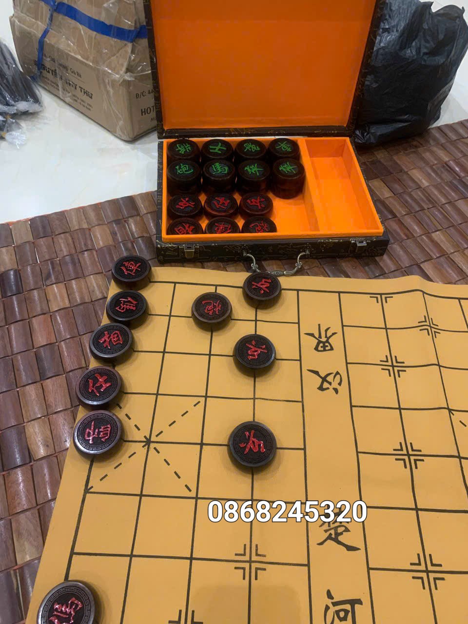 _ Bộ combo quân cờ tướng được làm bằng chất liệu gỗ trắc đỏ đen + hộp đựng gỗ hương tự nhiên 100% kèm theo tấm vải da đi cùng đủ bộ _ Kt quân
