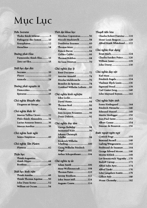 Hơn thế, với nội dung hấp dẫn, cách truyền tải dễ tiếp cận, cuốn sách sẽ đưa độc giả tiếp cận những quan điểm, tư tưởng của 100 triết gia vĩ đại trong nền triết học phương Tây, có thể kể tới như: Aristotle, Jean-Jacques Rousseau, Karl Marx, Simone de Beauvoir, Noam Chomsky, WVO Quine…