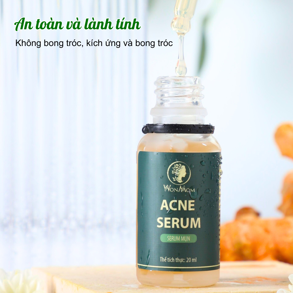 - Serum mụn Wonmom được chiết xuất rau má, lộc đề, ZinC bum, vitamin B5 giúp kiềm dầu, khô cồn mụn, tiêu nhân mụn.