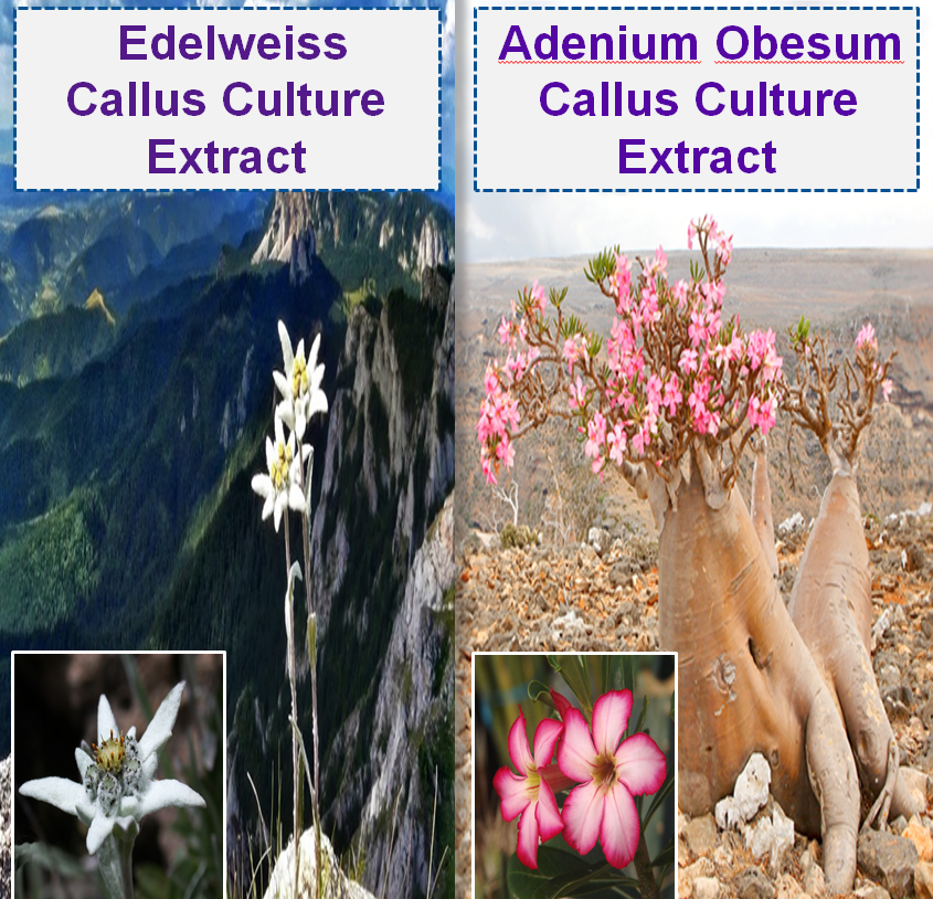 ☞ Chiết xuất nuôi cấy mô sẹo tế bào gốc Edelweiss và chiết xuất nuôi cấy mô sẹo gốc hoa hồng sa mạc vốn là những loại thực vật có khả năng duy trì sức sống mạnh mẽ ngay cả trong môi trường khắc nghiệt, từ đó cung cấp sức mạnh của các loài hoa đó vào sâu bên trong da để bảo vệ da khỏi các gốc tự do và các tác động kích thích bên ngoài, giúp da mịn màng và chắc khỏe.