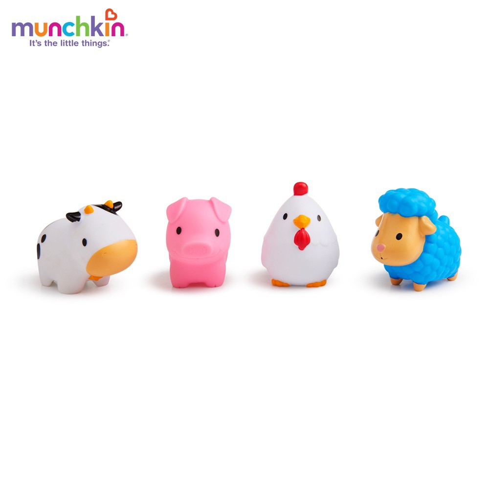 Bộ 4 sinh vật nông trại / sinh vật biển nhỏ Munchkin là bộ đồ chơi lý tưởng kích thích phát triển tư duy, giúp bé khám phá thế giới động vật xung quanh ngay từ khi còn rất nhỏ. 4 bạn động vật nông trại / sinh vật biển nhỏ có thể nổi trên nước, phun nước, bé thỏa thích chơi khi tắm. Màu sắc sặc sỡ tươi sáng giúp bé nhận dạng và phân biệt màu sắc. Kích thước nhỏ gọn dễ cầm nắm khi chơi. Phù hợp với trẻ từ 9 tháng tuổi trở lên. Tính giáo dục cao: Bộ 4 sinh vật nông trại / sinh vật biển nhỏ Munchkin được mô phỏng rất ngộ nghĩnh giúp bé nhận biết tên các con vật quen thuộc như lợn, cừu, bò, gà, cá heo, mực, chim cánh cụt, Màu sắc của các con vật cũng vô cùng phong phú (6 gam màu cơ bản là cam, hồng, đỏ, trắng, vàng, xanh dương) để bé vừa chơi vừa học và kích thích phát triển thị giác của bé. Nổi trên nước và phun nước: Đặc điểm này khiến bộ đồ chơi càng trở nên thú vị và hữu ích. Các bé sẽ tha hồ vui chơi với các bạn trong khi tắm, có thể bóp để chúng phun nước trong bụng ra, giúp bé tăng cường kỹ năng cầm nắm, vận động và luôn cảm thấy giờ tắm thật vui vẻ. Có kích thước vừa tay: Bé từ 9 tháng tuổi sẽ dễ dàng cầm nắm các con vật khi chơi, tăng cường kĩ năng vận động. Chất liệu an toàn: được làm từ nhựa cao cấp, không chứa BPA nên đảm bảo an toàn tuyệt đối. Dễ lau rửa vệ sinh: Mẹ có thể thường xuyên vệ sinh Đồ chơi bộ 4 sinh vật nông trại / sinh vật biển nhỏ Munchkin cho bé bằng dung dịch tẩy rửa nhẹ hoặc bằng nước thường để đảm bảo đồ chơi luôn sạch và bền như mới. Kích thước 1 con: 544cm