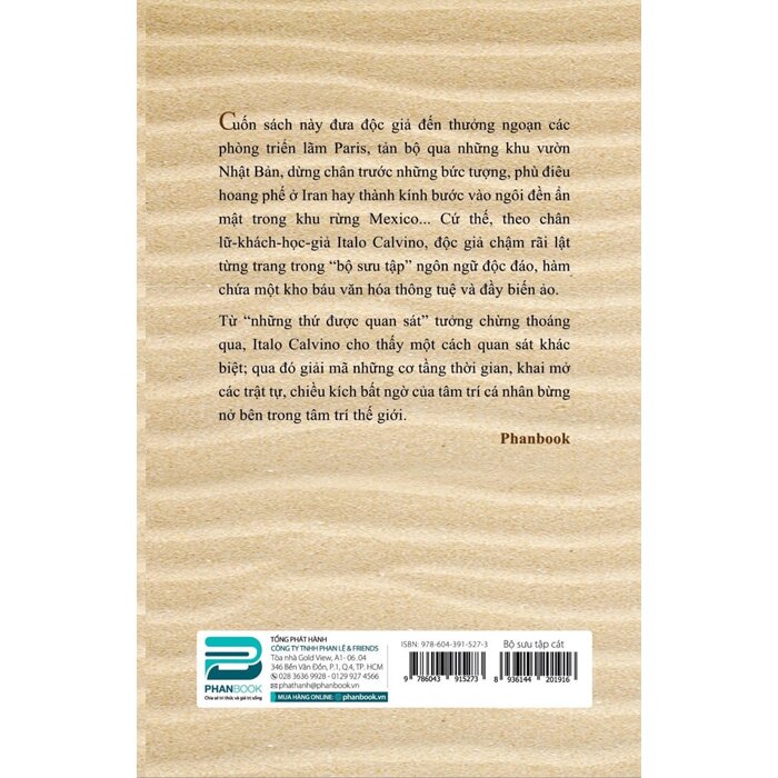 Cuốn sách này đưa độc giả đến thưởng ngoạn các phòng triển lãm Paris, tản bộ qua những khu vườn Nhật Bản, dưng chân trước những bức tượng, phù điêu hoang phế ở Iran hay thành kính bước vào ngôi đền ẩn mật trong khu rừng M Cứ thế, theo chân lữ khách học giả Italo Calvino, độc giả chậm rãi lật từng trang trong "bộ sưu tập" ngôn ngữ độc đáo, hàm chứa một kho báu văn hóa thông tuệ và đầy biến ảo.