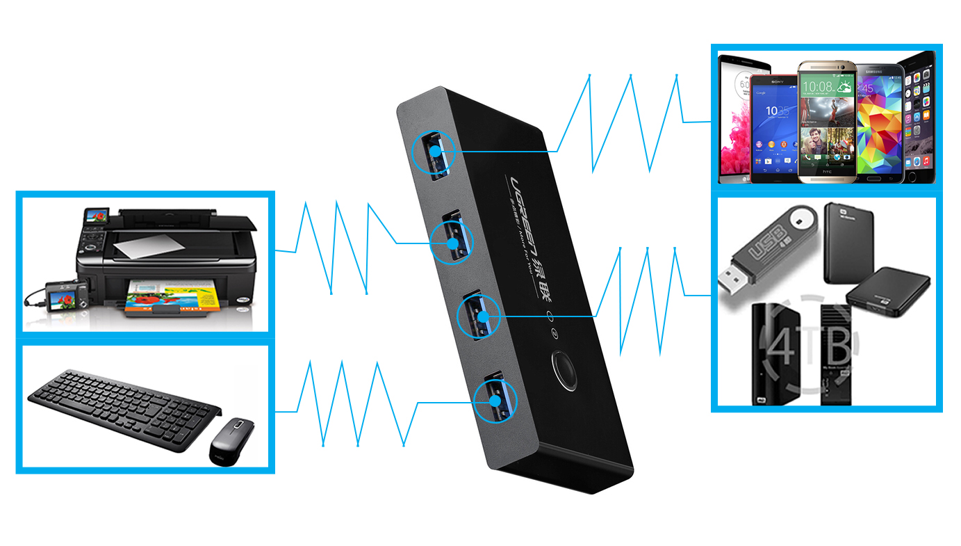 - Bộ Chuyển Mạch USB 3.0 4 Cổng Ugreen 30768 là sự lựa chọn tuyệt vời để chia sẻ 4 thiết bị USB giữa hai máy tính cá nhân. Một giải pháp lý tưởng để chia sẻ một máy in hoặc máy quét trong môi trường văn phòng hoặc tại nhà của bạn.