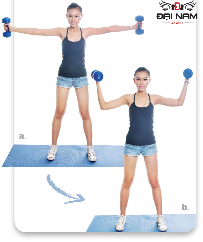 -Ðứng thẳng, nắm mỗi tay một tạ, lòng bàn tay ngửa về phía trước, hai tay sát cơ thể. Nâng từ từ hai tạ lên cho đến khi cẳng tay chạm vào bắp tay. Giữ trạng thái co này và gồng bắp tay khoảng 1 giây, sau đó từ từ hạ tạ xuống.