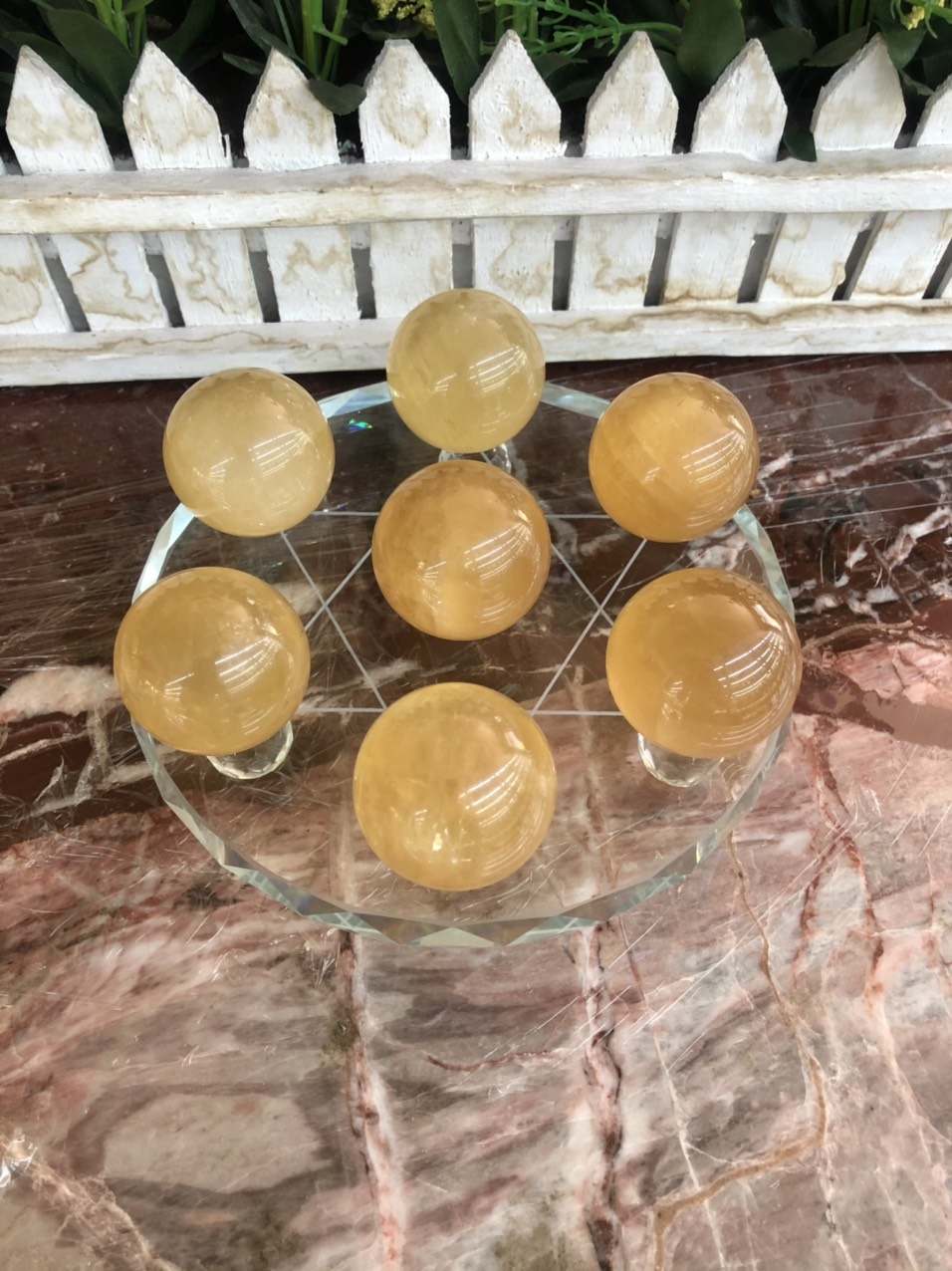 Mua tại TiktokHợp mệnh Thổ - Kim Chất liệu: Dĩa là chất liệu pha lê và tất cả quả cầu là đá thạch anh Kích thước: Đường kính dĩa 12cm, Đường kính quả cầu 3,5 cm Khối lượng: 1,15 kg Thất tinh trận đồ gồm 7 viên đá quý được nối với nhau bằng ngôi sao David, sự liên kết này tạo ra 1 vùng năng lượng rất lớn. Nó có khả năng trấn trạch, hóa sát, vượng khí, chiêu tài…