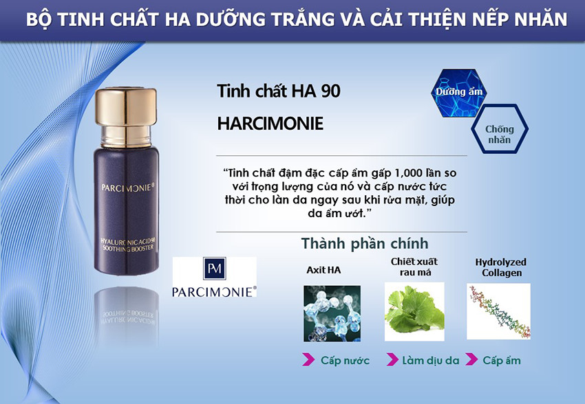 -Tinh chất Parcimonie hyaluronic acid 90 soothing booster có chứa đến 90% Hyaluronic Acid (HA) tự nhiên , một hợp chất dưỡng ẩm tự nhiên và đóng vai trò quan trọng để duy trì cấu trúc và các lớp da.