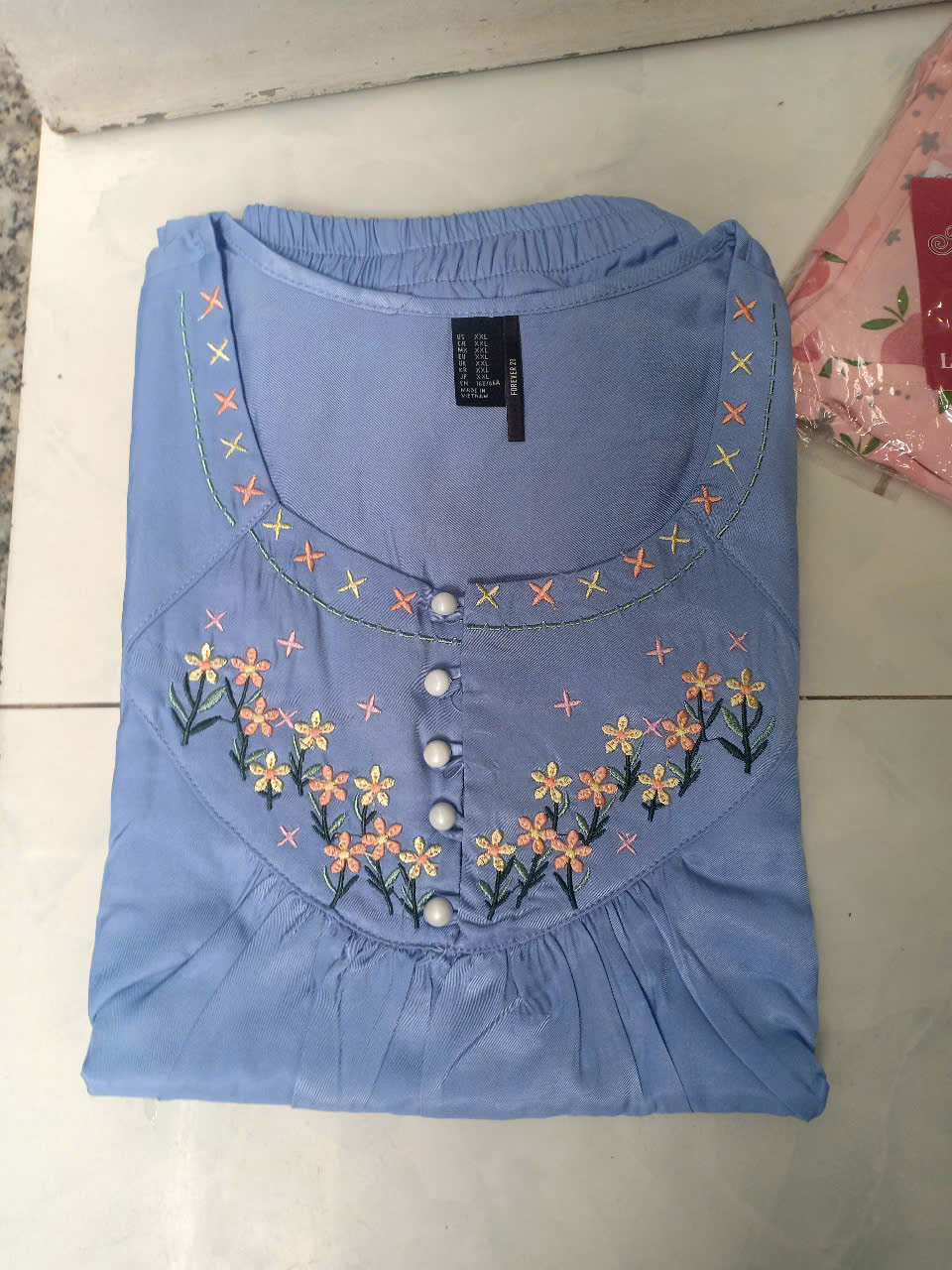 Đặc điểm nổi bật: - Cổ lá sen, tay lỡ - Kẹp ren trắng ở phần lá cổ, lai tay, lai quần - Chất liệu thun - Dáng bộ đồ dài - Thiết kế và