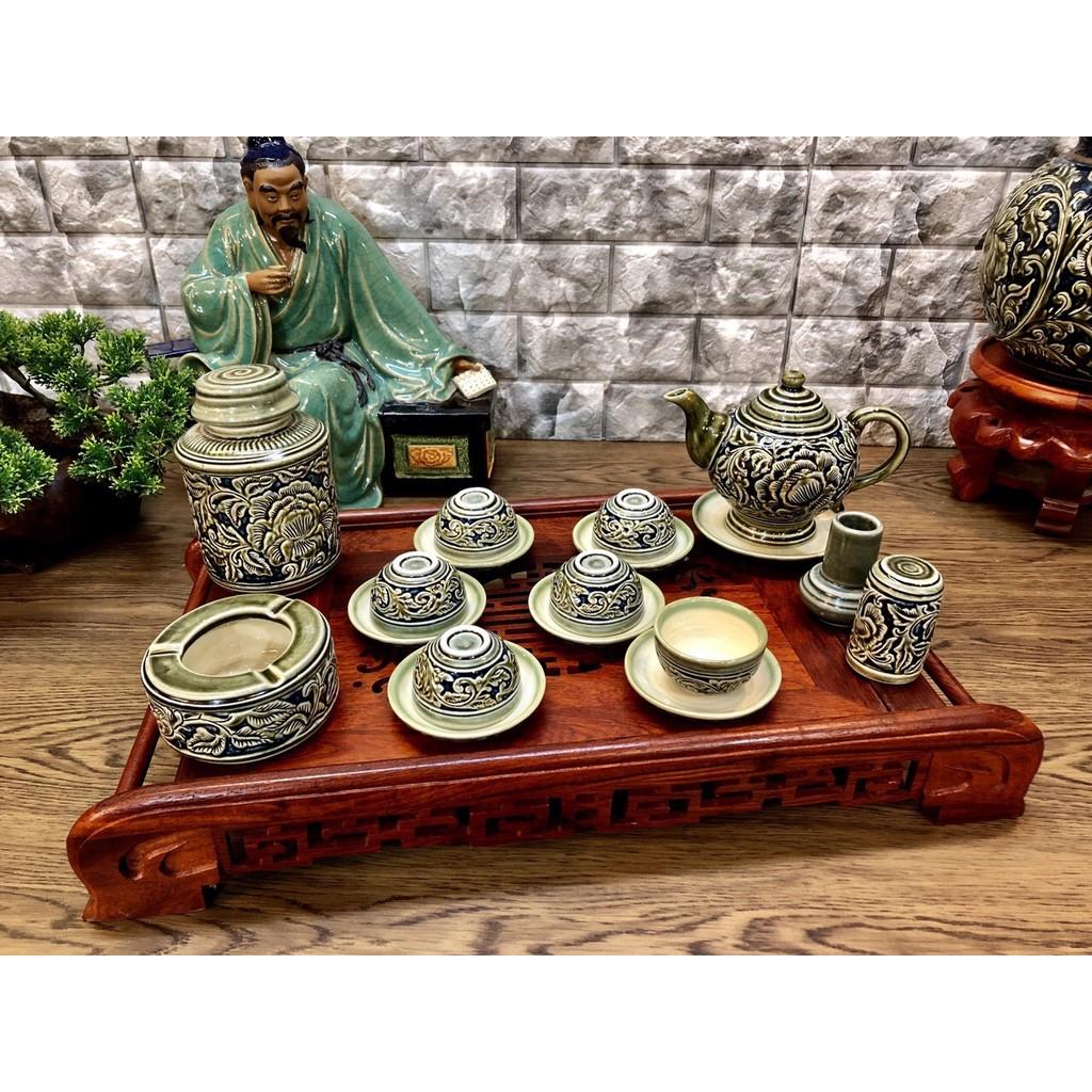 Bộ đồ ăn mặt trời + phụ kiện Bát Tràng vẽ tay khắc hoa men lục bảo S6 Gốm sứ gia dụng - bộ đồ ăn truyền thống Thương hiệu - Bát Tràng. Chất liệu: