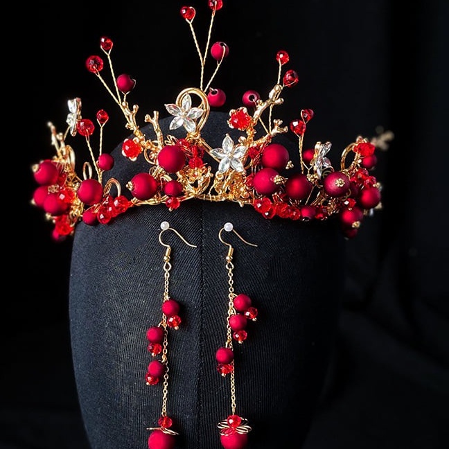 ✨Bộ trang sức trang điểm cô dâu Vương miện và bông tai ngọc đỏ nổi bật VM19