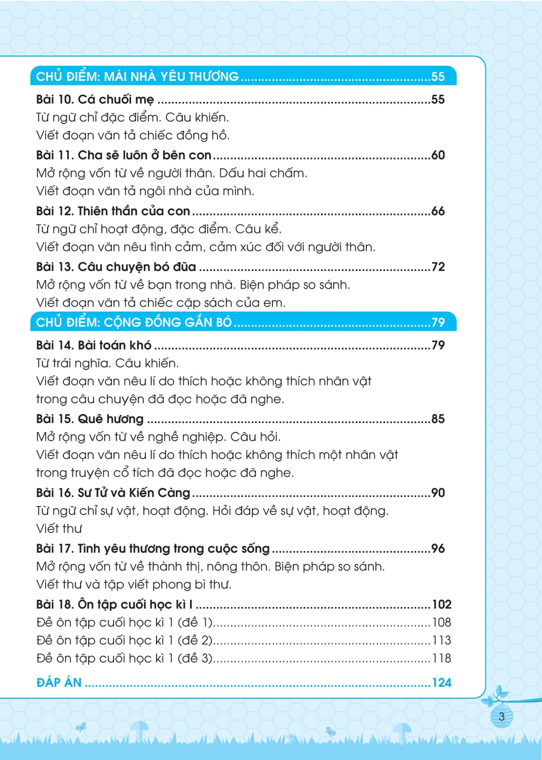 - Bài tập nâng cao: Phần này sẽ cung cấp 1 số các bài tập và hoạt động mang tính thử thách hơn, để các em thử sức, luyện tập tư duy sâu từ đó trau dồi và nâng cao kiến thức. Cuốn sách cũng cung cấp 3 đề ôn tập cuối kì với thang điểm cụ thể, để các em tự ôn luyện và đánh giá đúng mức độ nắm kiến thức, chuẩn bị tốt kiến thức và tâm lý cho bài kiểm tra cuối kì.
