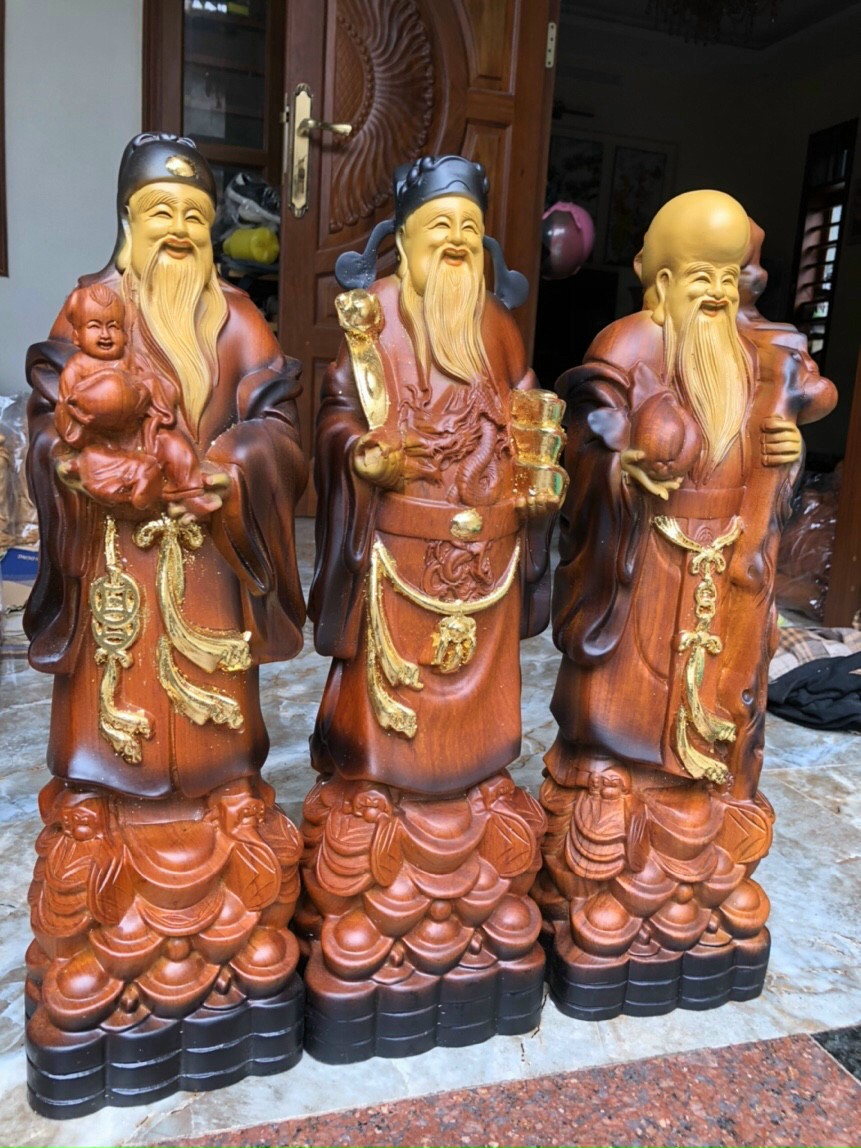 _ Tượng phật tam đa phúc lộc thọ được làm bằng chất liệu gỗ hương đá tự nhiên 100% .Và được tô làm bóng tô mầu giả cổ _ Kích thước cao 70×22×16cm _ Tượng