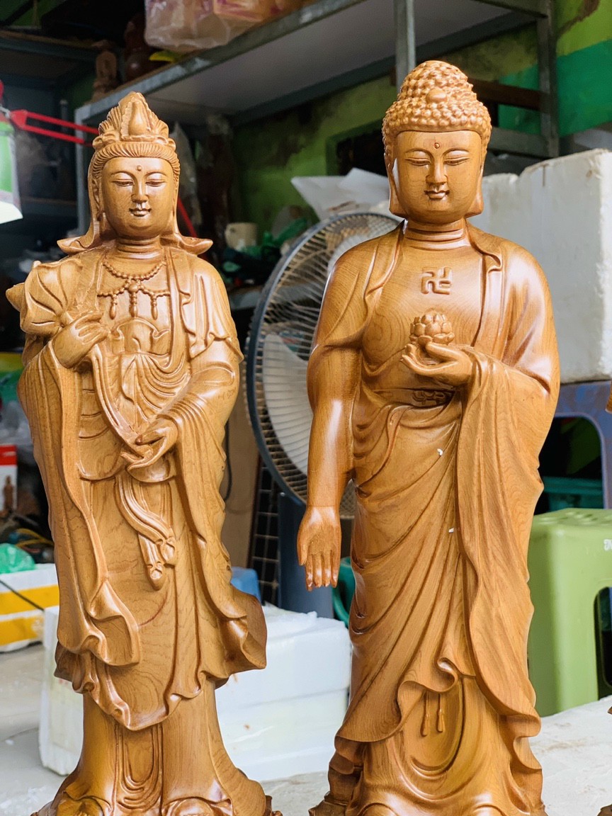 Bộ tượng phật tam thánh được làm bằng chất liệu gỗ bách xanh thơm nức tự nhiên 100% Kích thước cao 40×12cm _ Bộ tượng phật tam thánh được trạm khắc tỉ mỉ tinh sảo kỳ công .Đi hầu hết tất cả mọi chi tiết nội dung hoa văn của tượng phật đều được ngọt tỉa chỉnh sửa hoàn toàn bằng tay thủ công .Cũng như được làm và hoàn thiện đều do bàn tay khối óc tài hoa ,Từ những người thợ dầy rặn kinh nghiệm .Cũng như tay nghề cao trong làng nghề truyền thống .Chính vì thế bộ tượng phật tam thánh đã đáp ứng đầy đủ những tiêu trí ( Đẹp bền rẻ ) Thẩm mỹ nghệ thuật với chất lượng tuyệt vời