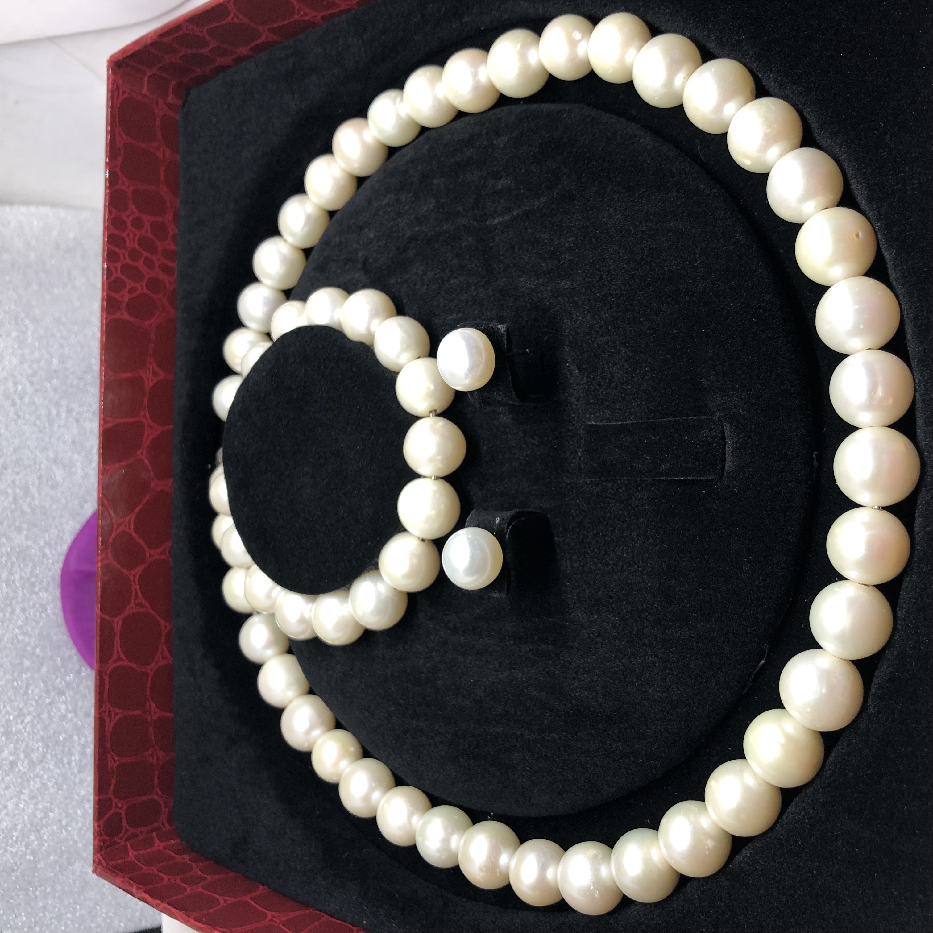 Chất liệu: Ngọc trai nuôi Kích thước: Hạt 8 - 9 mm Bao gồm: Dây chuyền đeo cổ, vòng đeo tay và bông tai Sang trọng để làm quà tặng người phụ nữ yêu quý