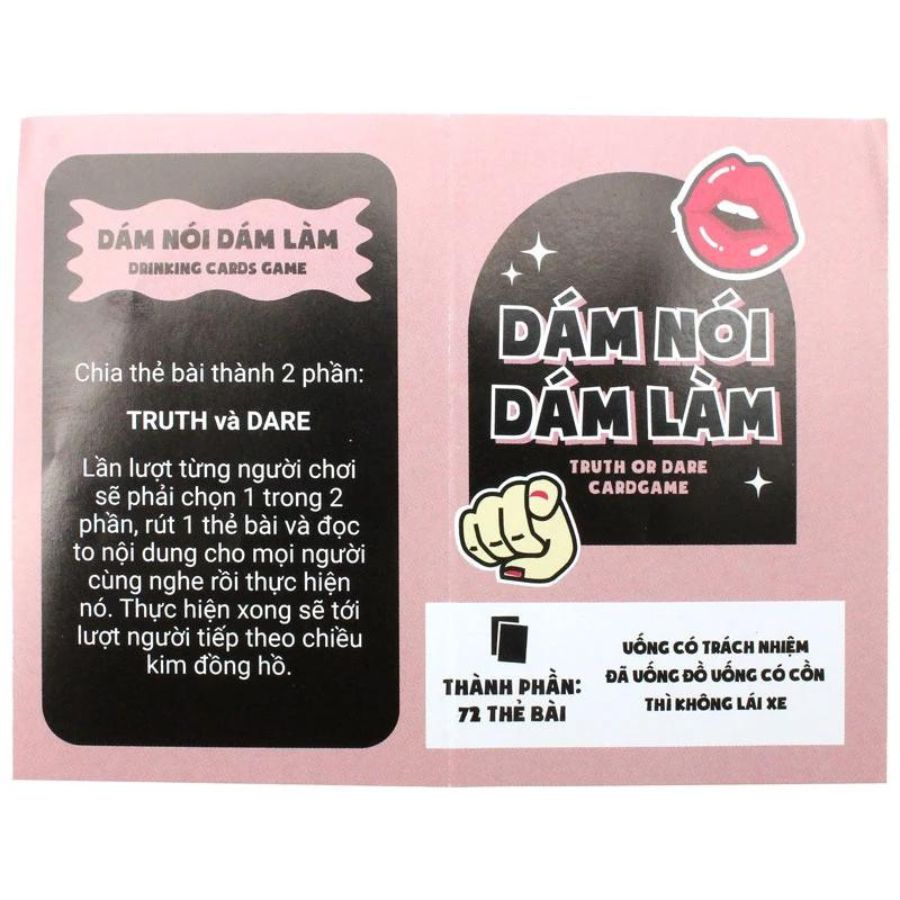 Mua tại TiktokGiới thiệu Boardgame Dám Nói Dám Làm - Truth Or Dare Game - BGV Những buổi ăn nhậu đầy thức uống ngon và mồi thơm nghe thì cũng thích đấy, nhưng bạn đã thử vừa chill vừa chơi Truth Or Dare game chưa? Hứa hẹn là vui banh nóc luôn! Tạm biệt những buổi gặp mặt tẻ nhạt và nhàm chán, cuộc vui của bạn sẽ thêm phần thú vị với hàng loạt thẻ bài siêu bựa sẽ giúp bạn đẩy nhanh quá trình “gãy” của những đứa khác trên bà Lưu ý: Uống có trách nhiệm - đã uống rượu bia thì không lái xe. Gồm 72 thẻ bài - Chia thẻ bài thành 2 phần: TRUTH và DARE Lần lượt từng người chơi sẽ phải chọn 1 trong 2 phần, rút 1 thẻ bài và đọc to nội dung cho mọi người cùng nghe rồi thực hiện nó. Thực hiện xong sẽ tới lượt người tiếp theo chiều kim đồng hồ.